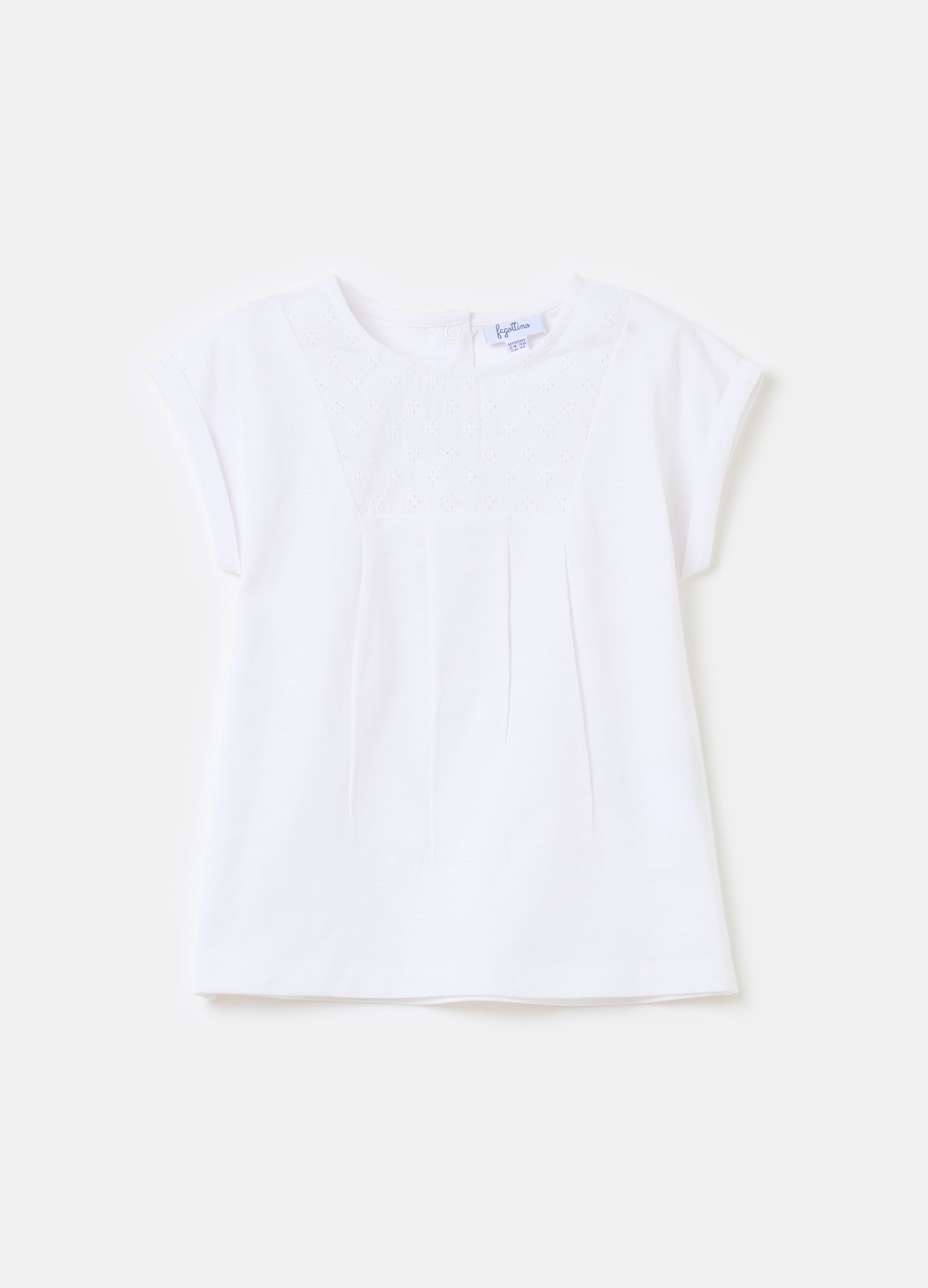 Iridescent-effect 100% cotton T-shirt. Round neck with snap buttons on the back. Broderie anglaise lace insert with darts on the front. Fixed turn-up sleeve cuffs.