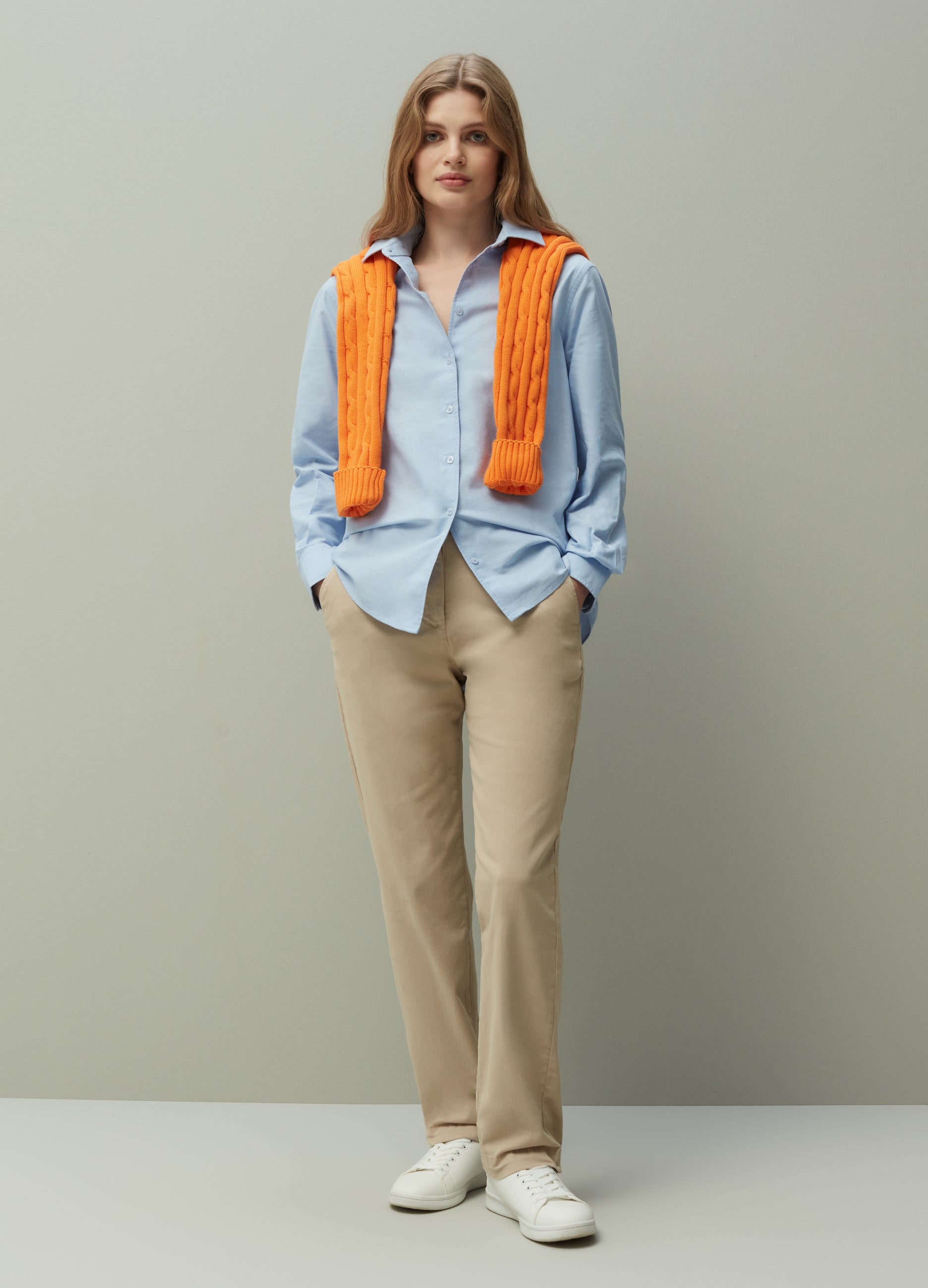 PIOMBO stretch cotton chinos. Two slant pockets and two welt pockets on the back. Zip and button fastening.