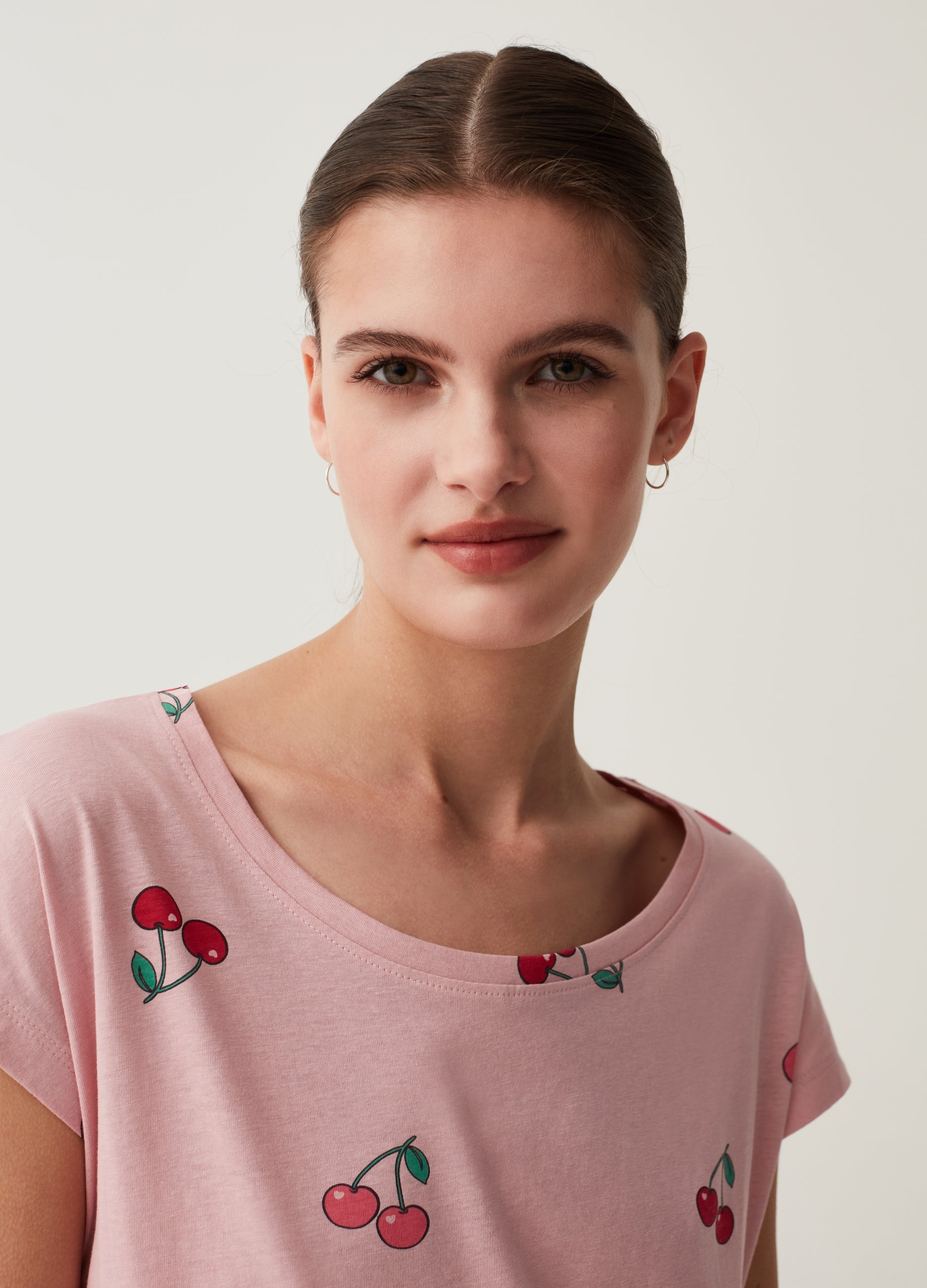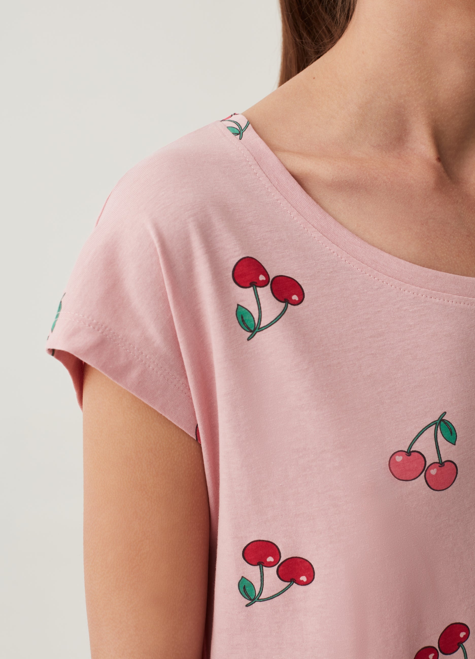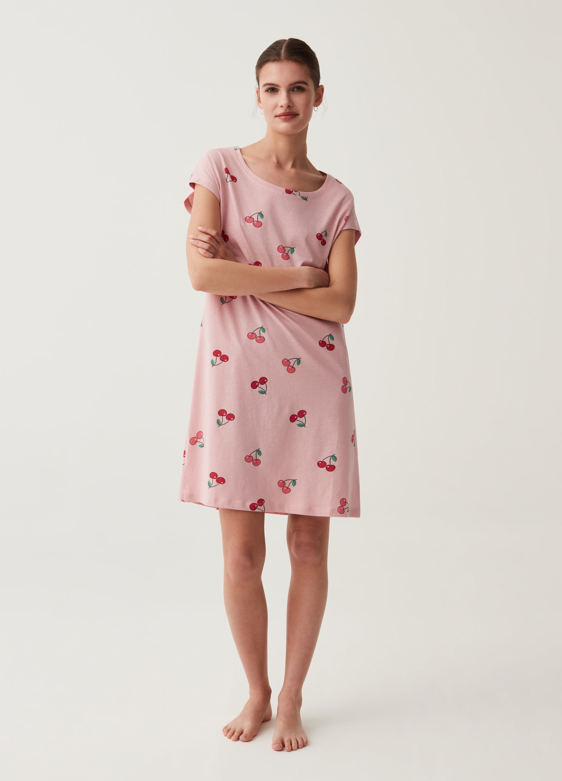 Short nightdress in 100% cotton with all-over cherries print. Round neck. Kimono sleeves.