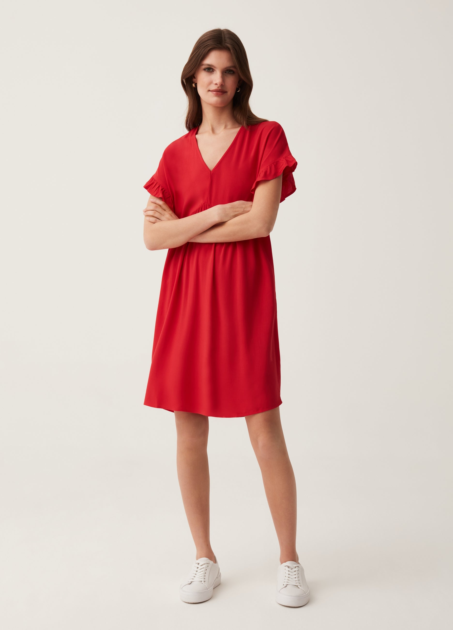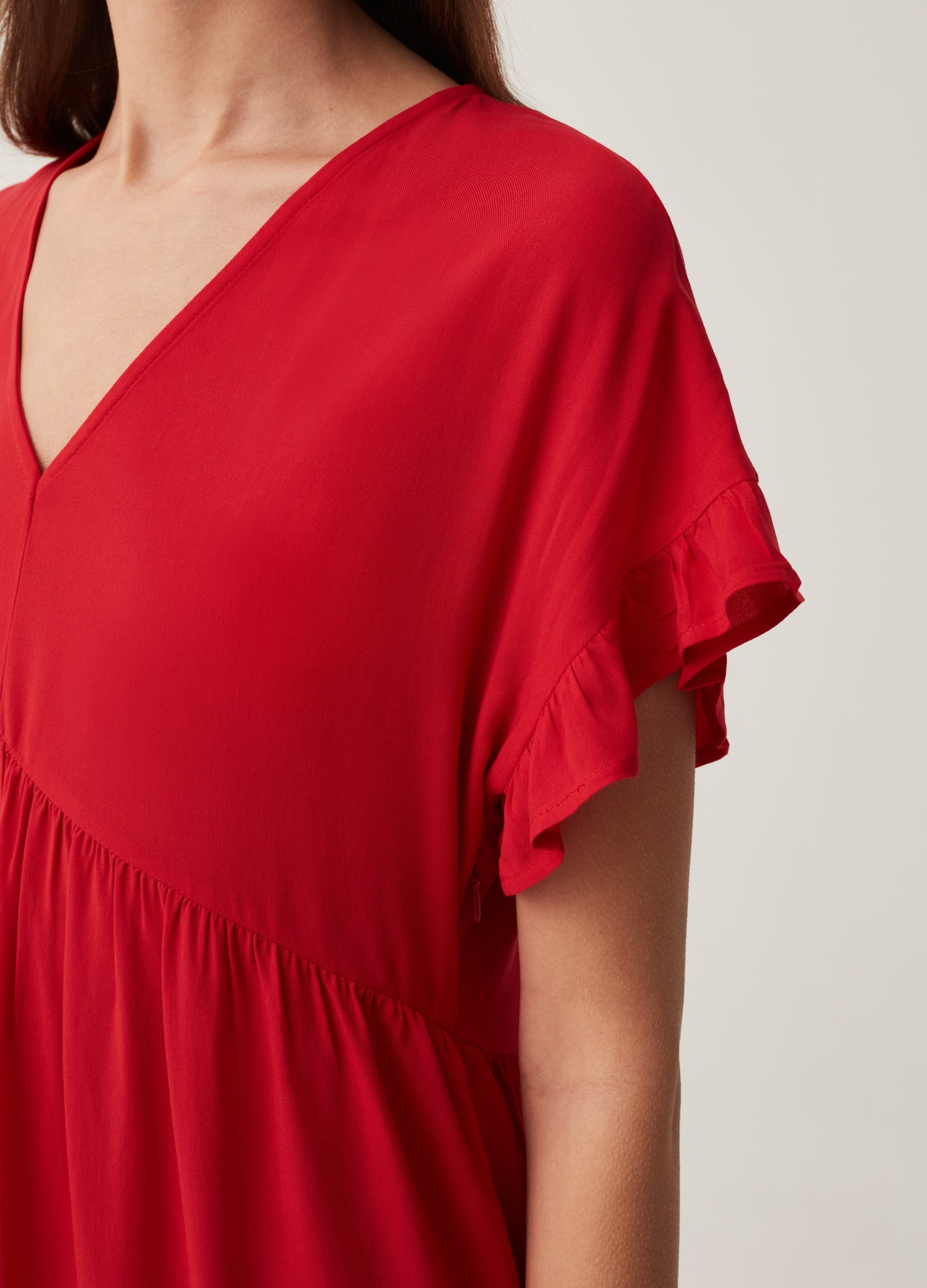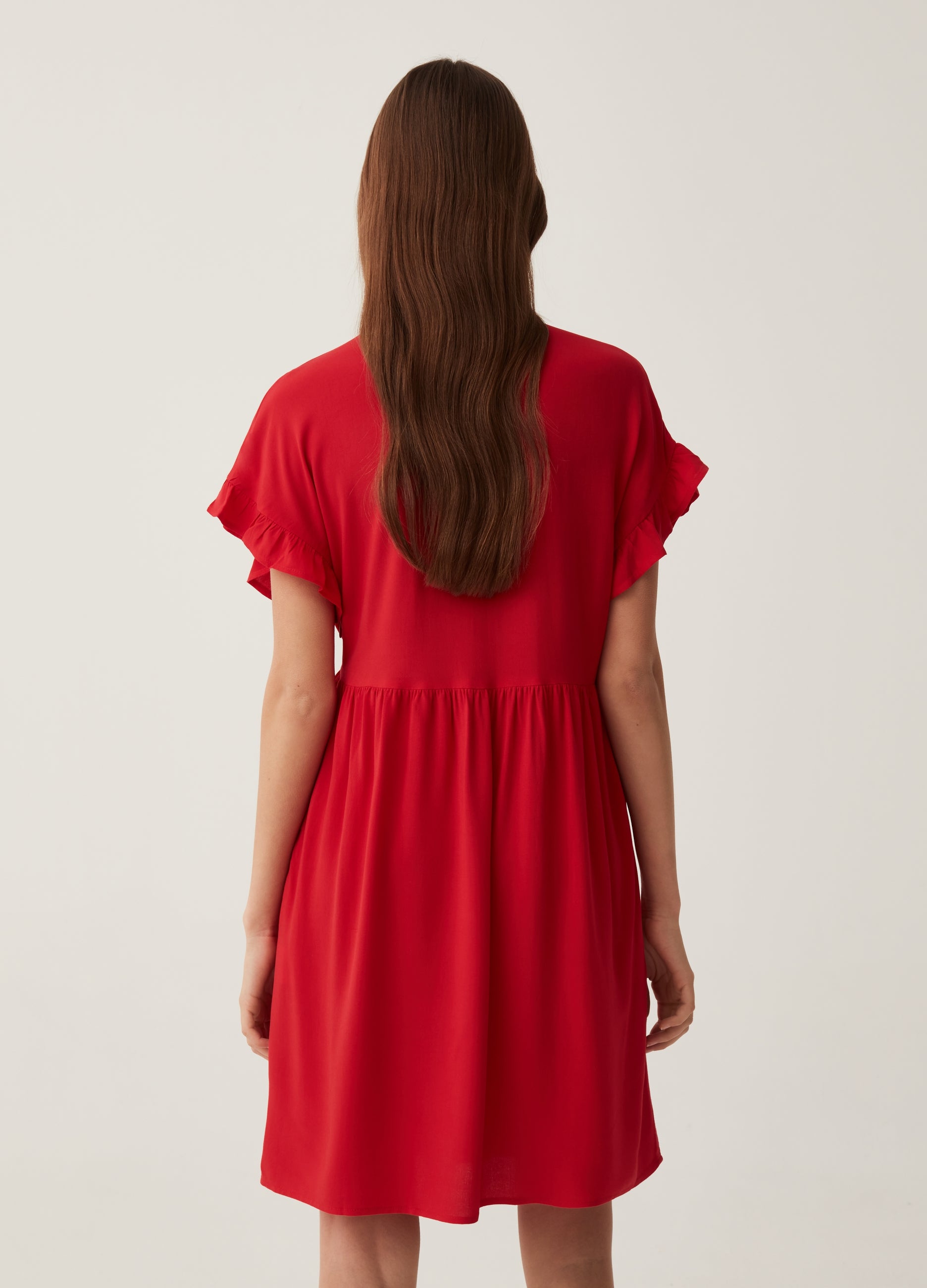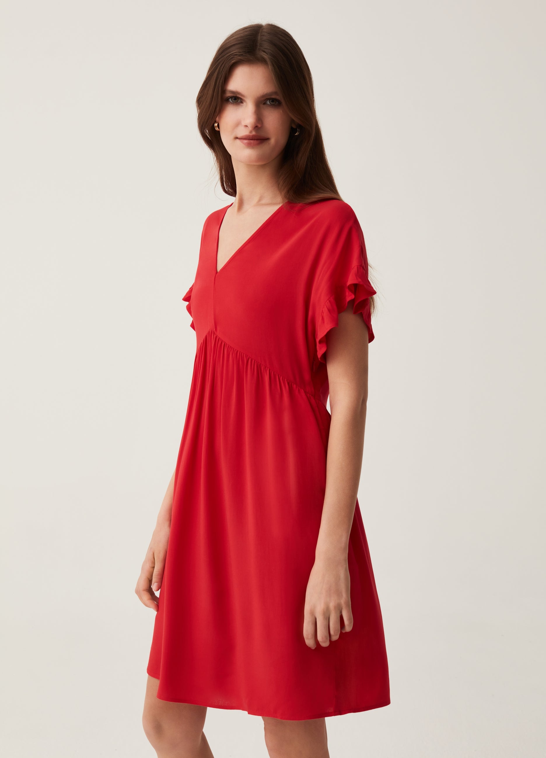 Short dress in 100% sustainable viscose with FSC® certification. V-neck. Kimono short sleeves with ruffles.