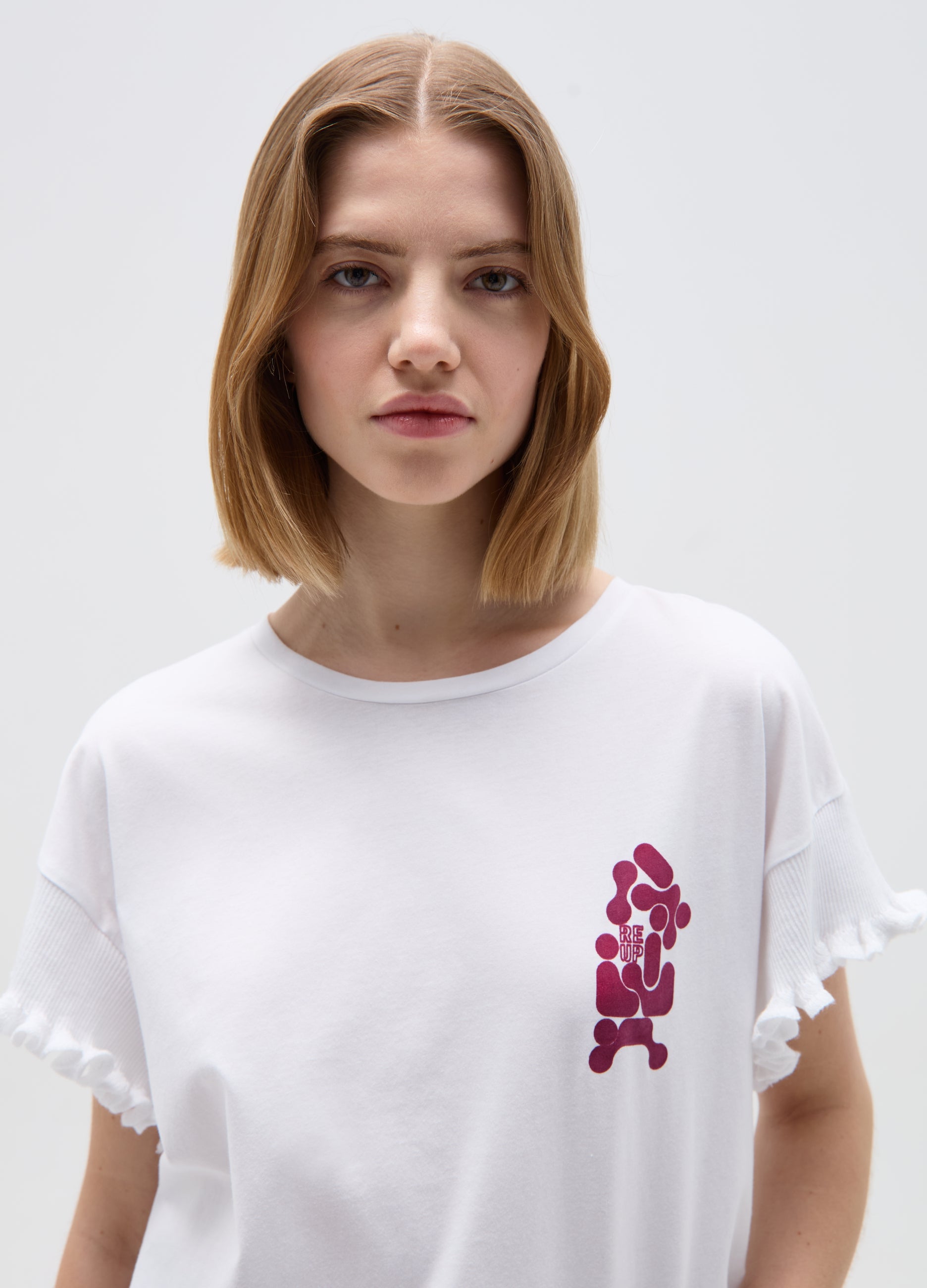 100% cotton T-shirt. Round neck. Sleeves with drop shoulders and frills on the hem. RE-UP print on the chest. RE-UP is the first OVS recycling project made thanks to life by the creativity of the Valemour young people with general learning disabilities, using the Officina+39 Recycrom™ sustainable dyes. Slight differences in the product are due to the handmade custom painting, making each item unique and different from the others.