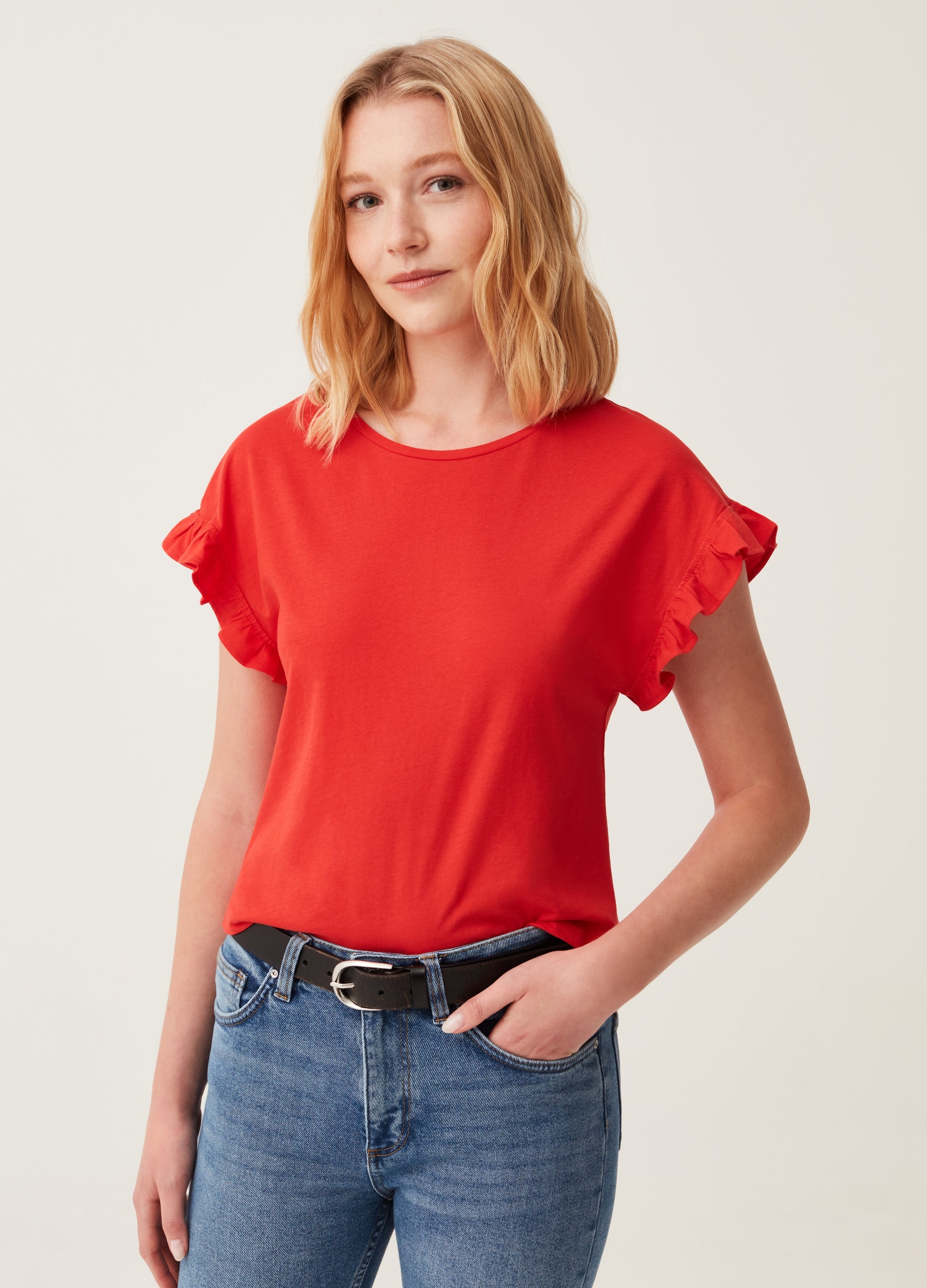 Round-neck T-shirt in 100% cotton. Kimono sleeves with ruffled cuffs.