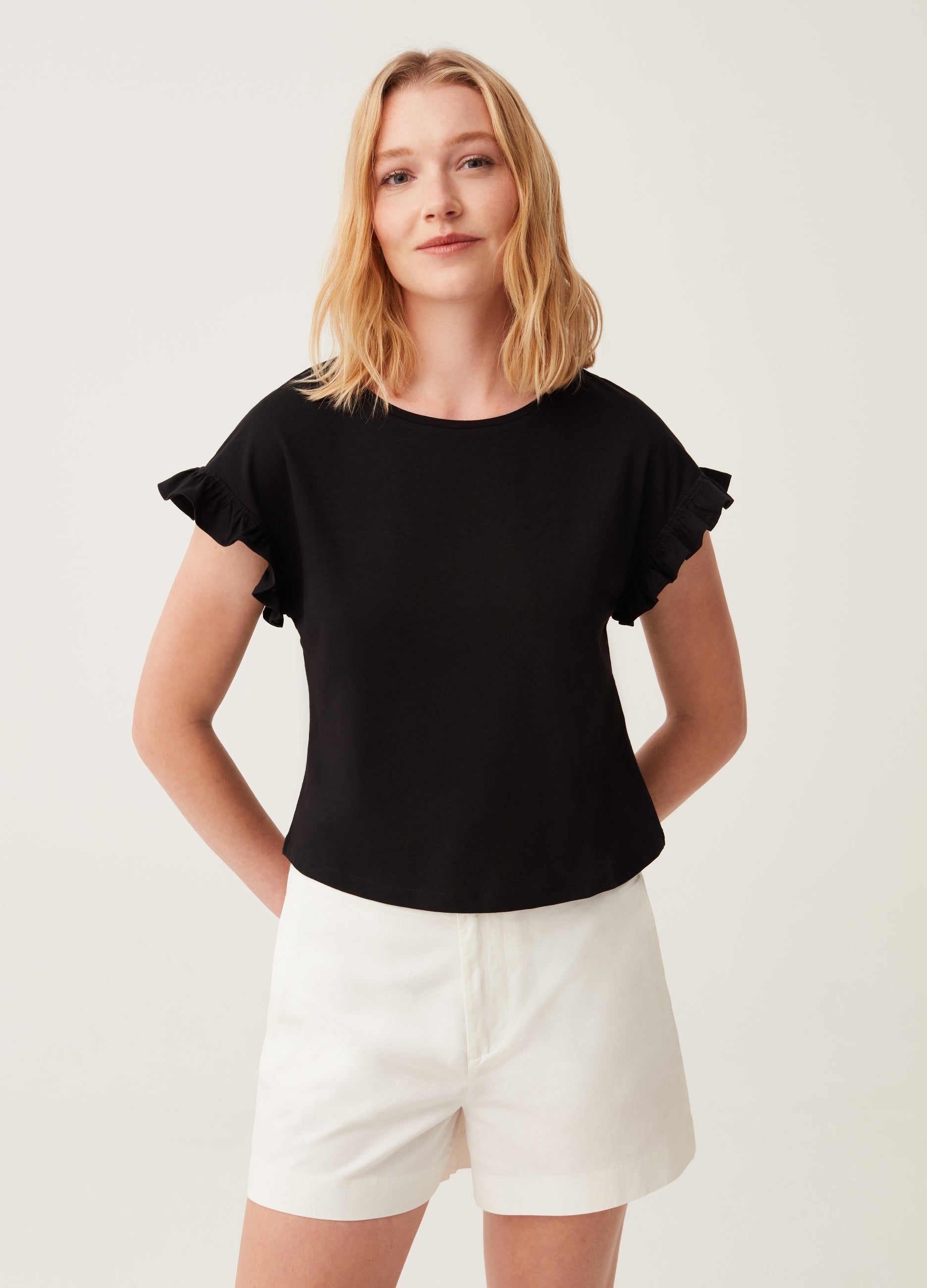 Round-neck T-shirt in 100% cotton. Kimono sleeves with ruffled cuffs.