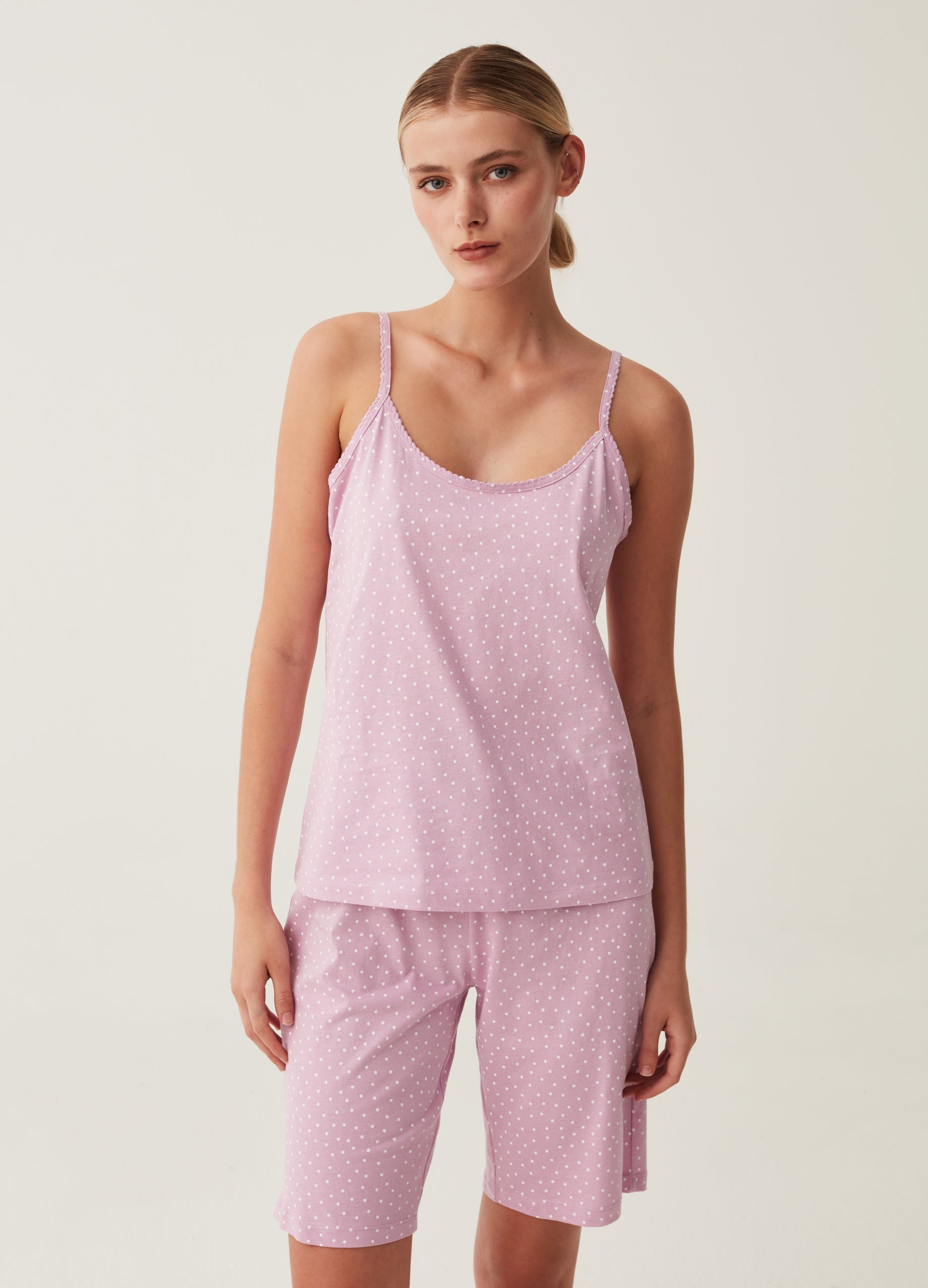 100% cotton pyjama top with polka dot pattern. Wide round neck and spaghetti straps with wavy edging.