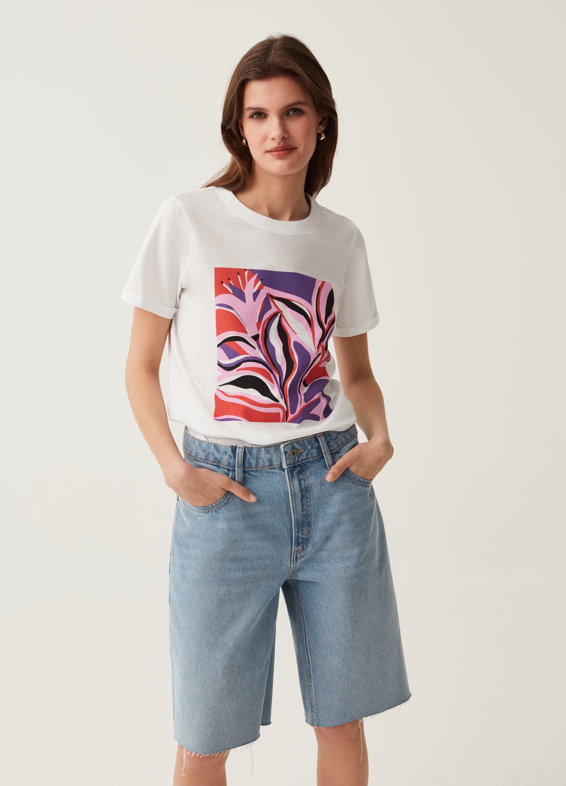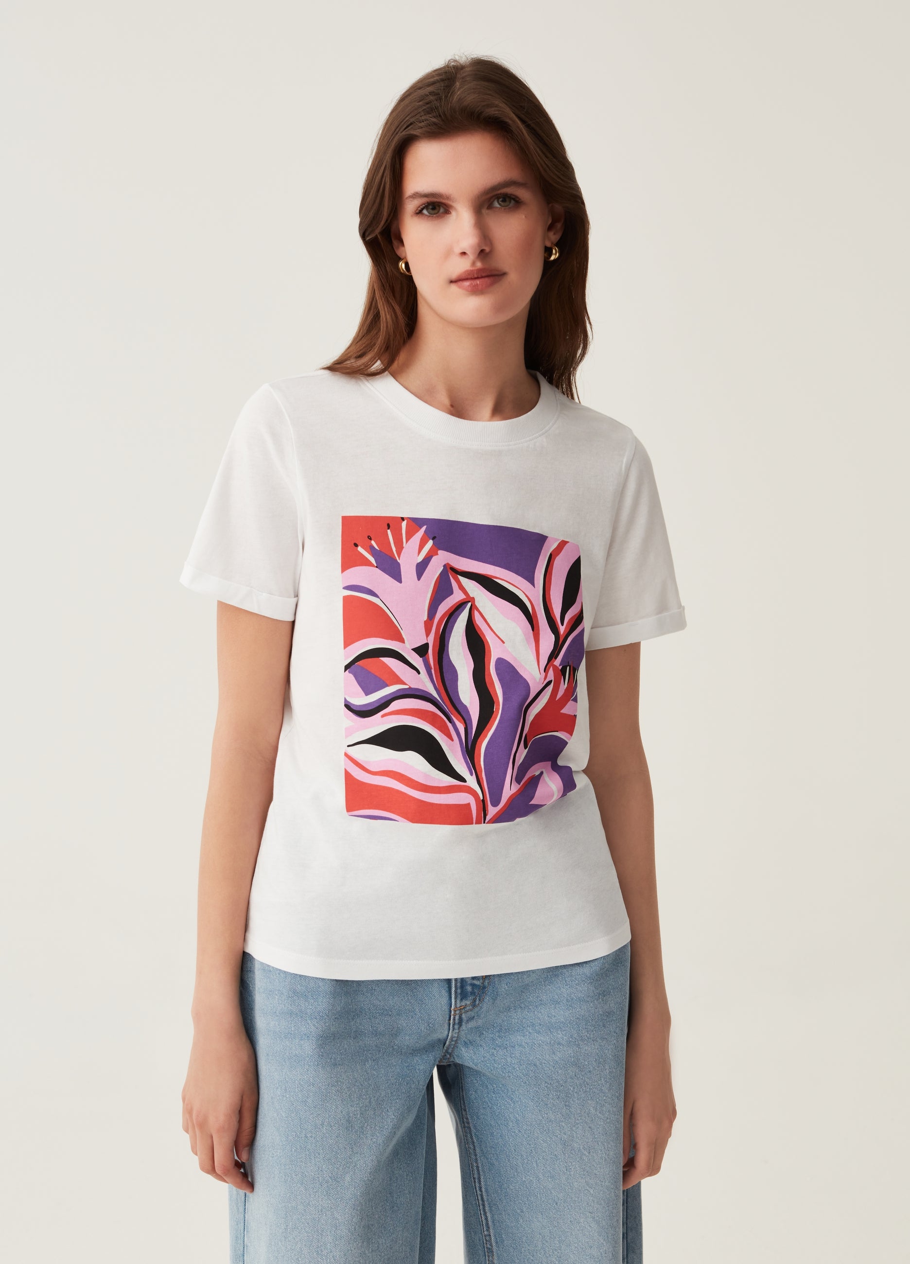 100% cotton T-shirt. Round, ribbed neck. Fixed turn-up hem on the sleeve. Foliage print on the front.