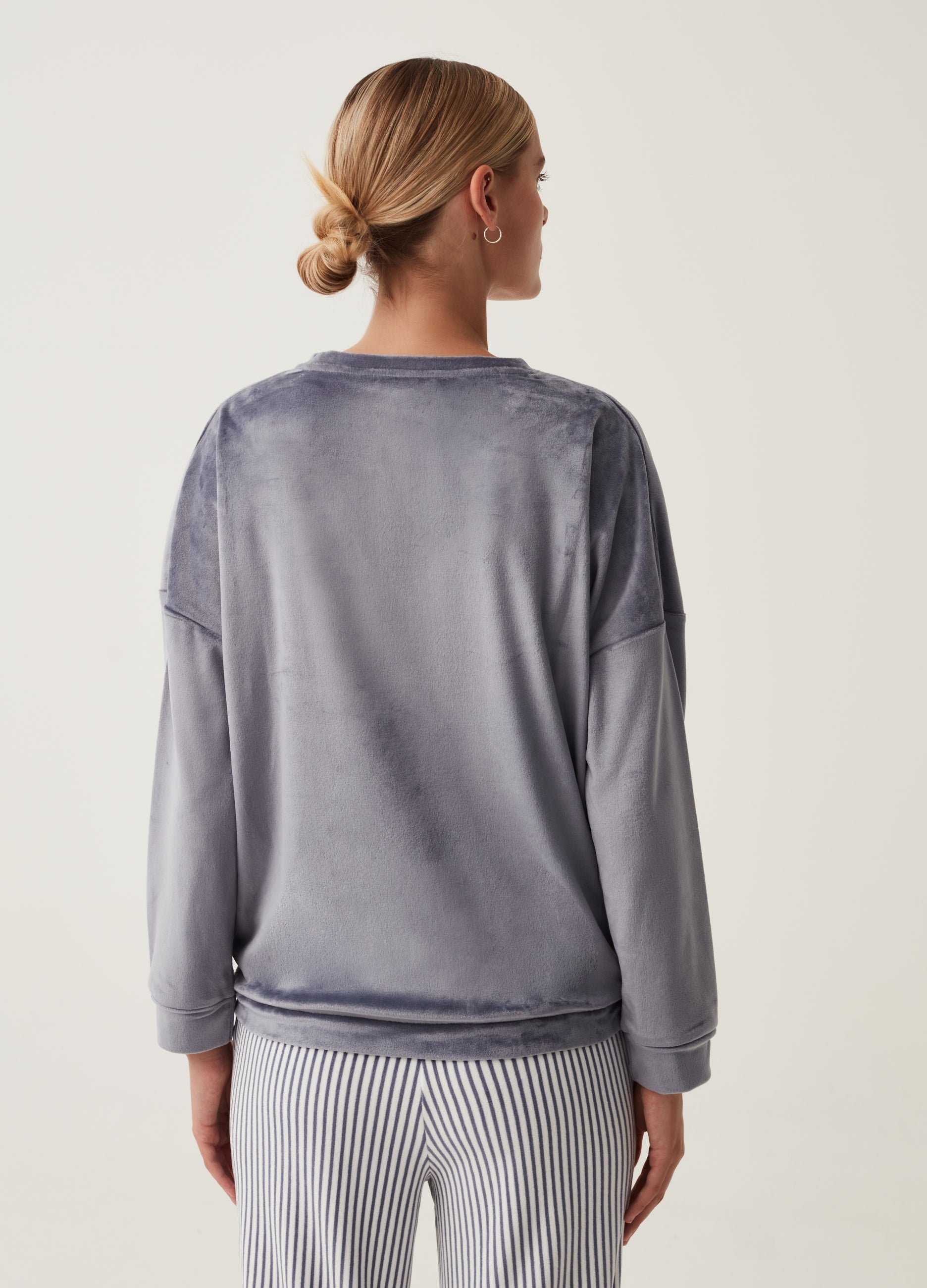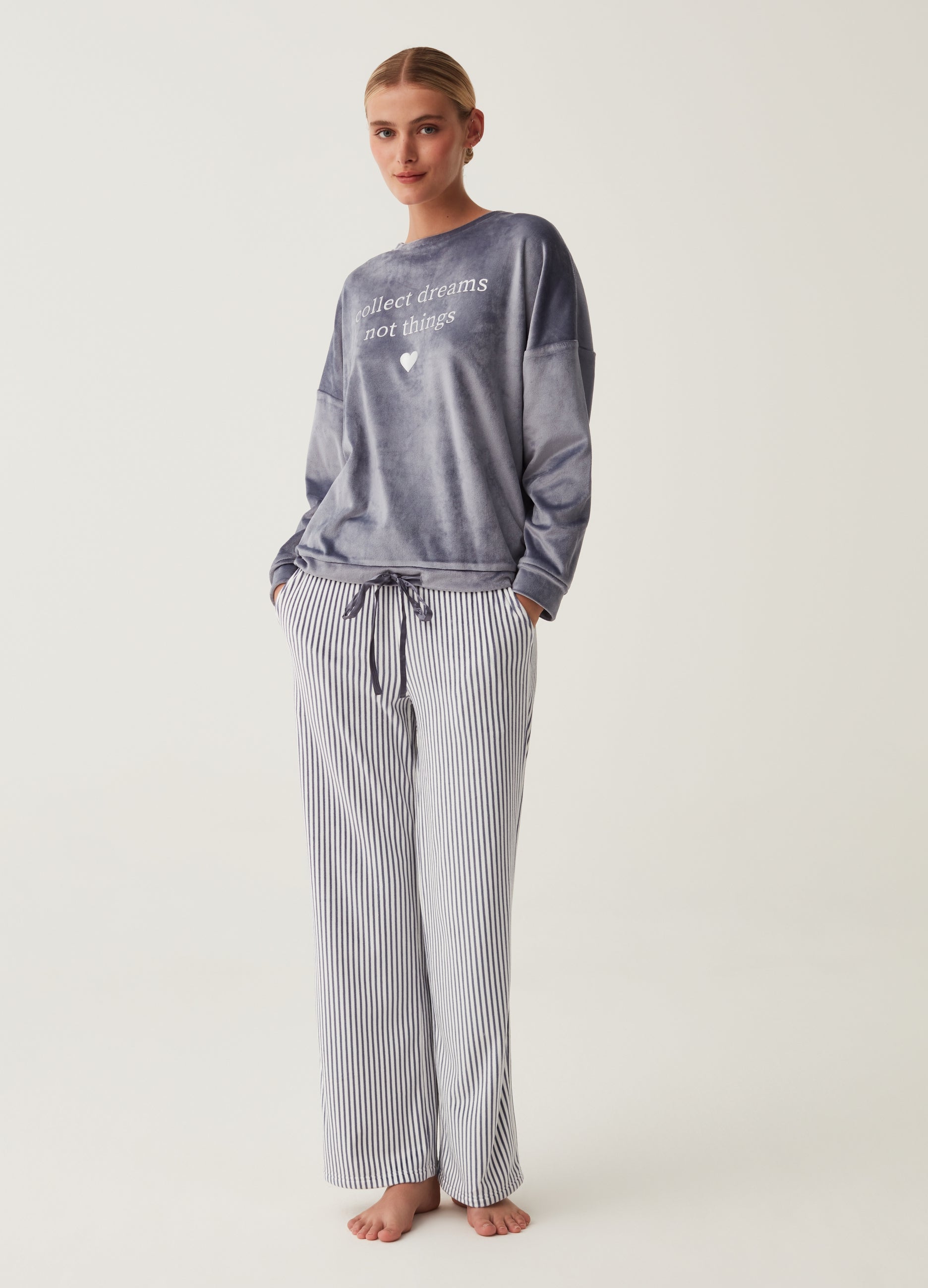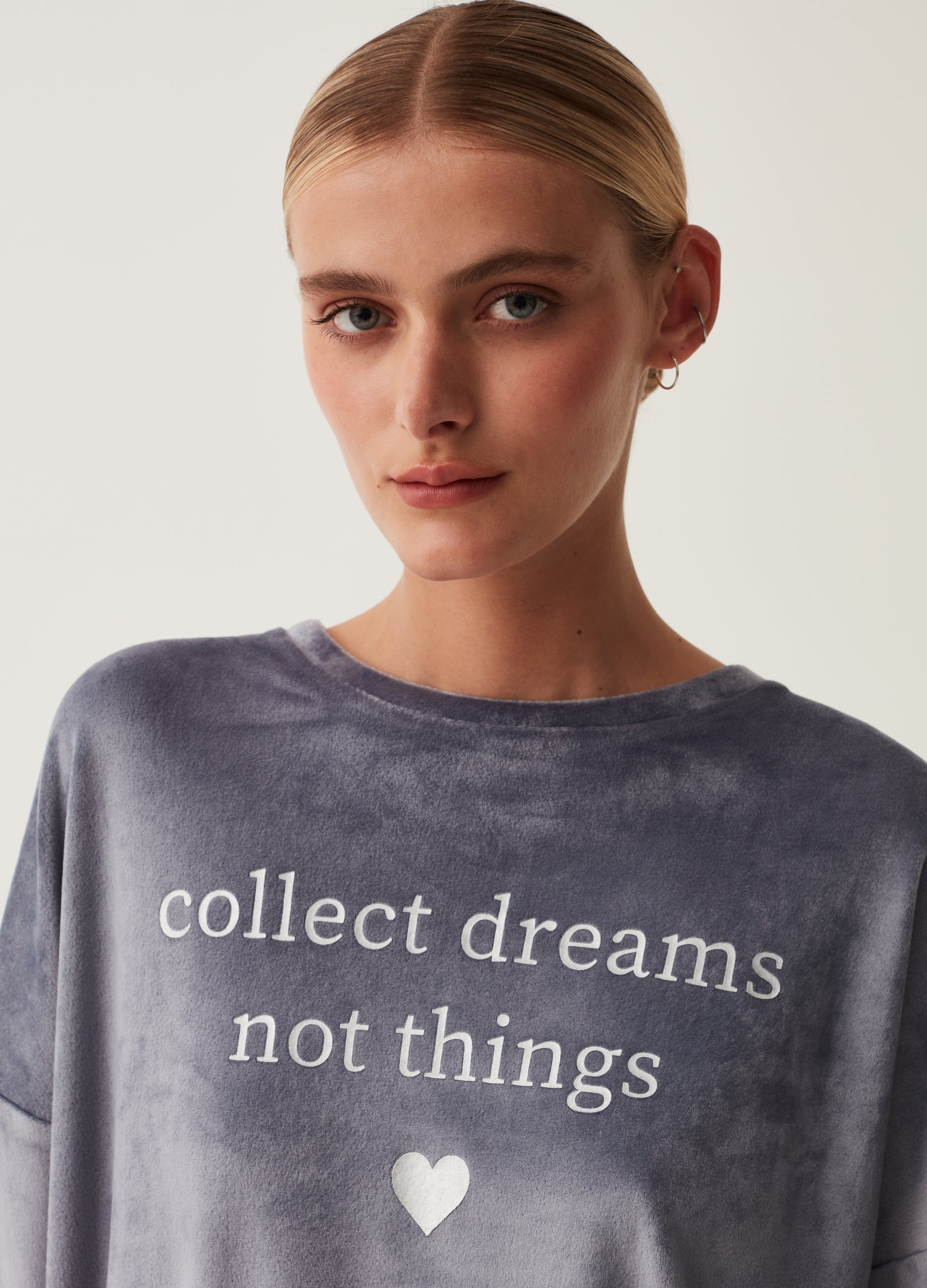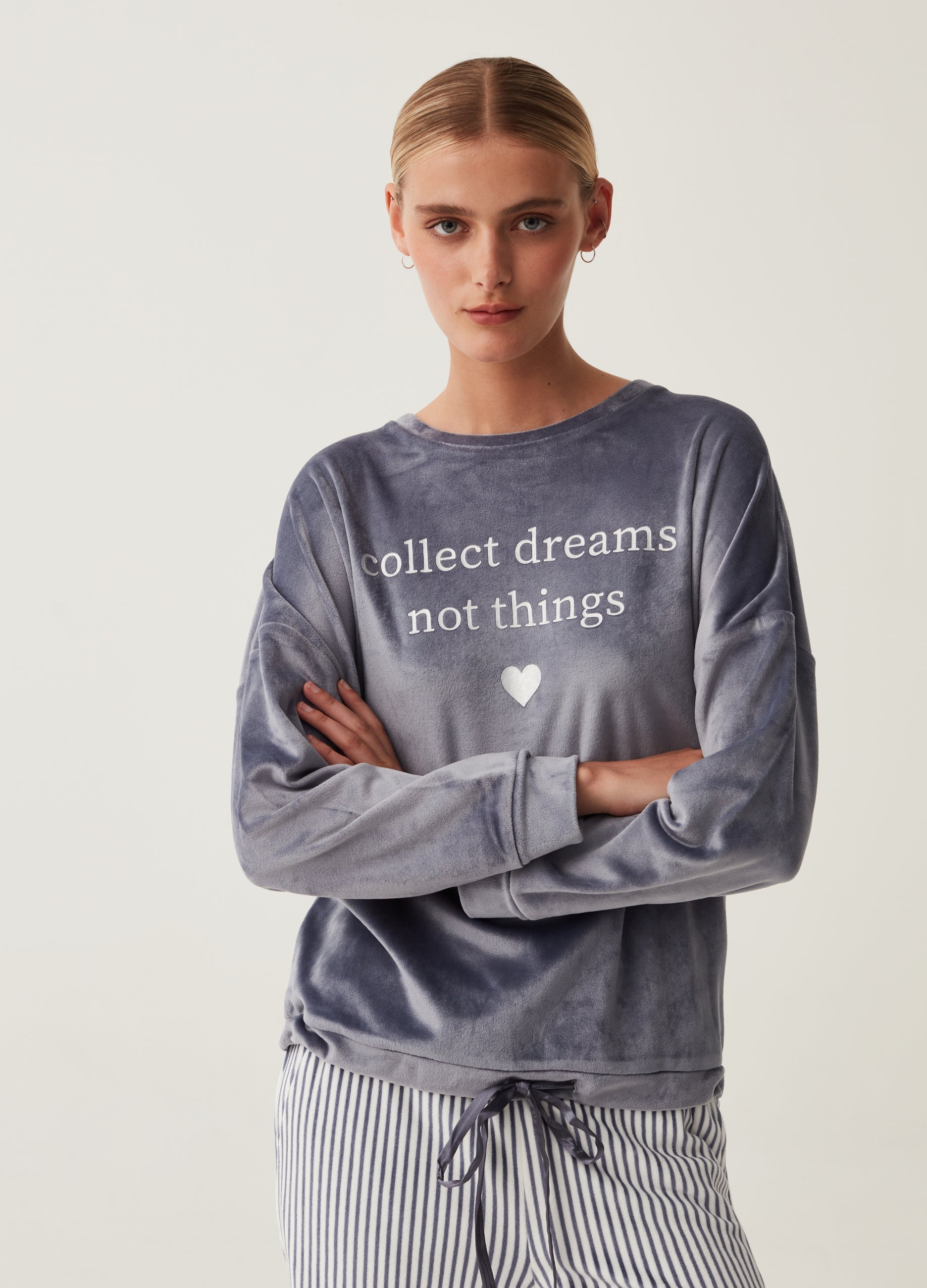 Long-sleeved velour pyjama top with lettering embroidery and heart. Round neck. Drop shoulders.