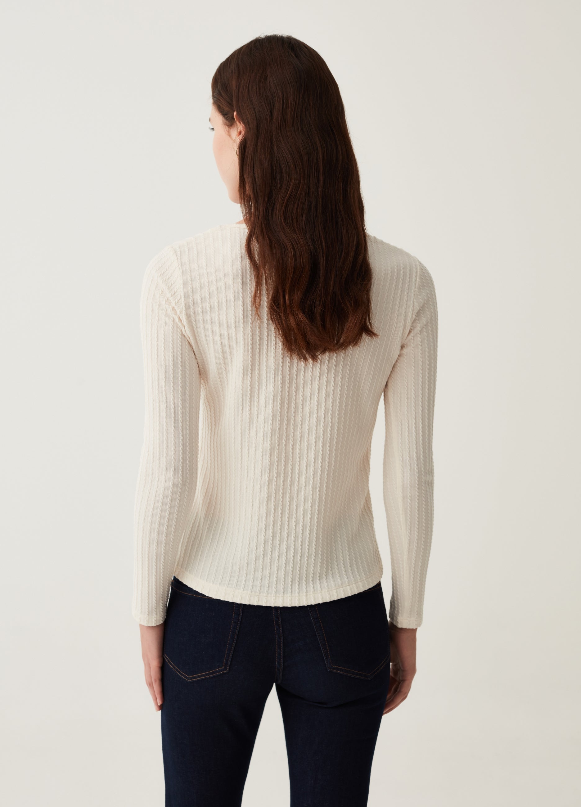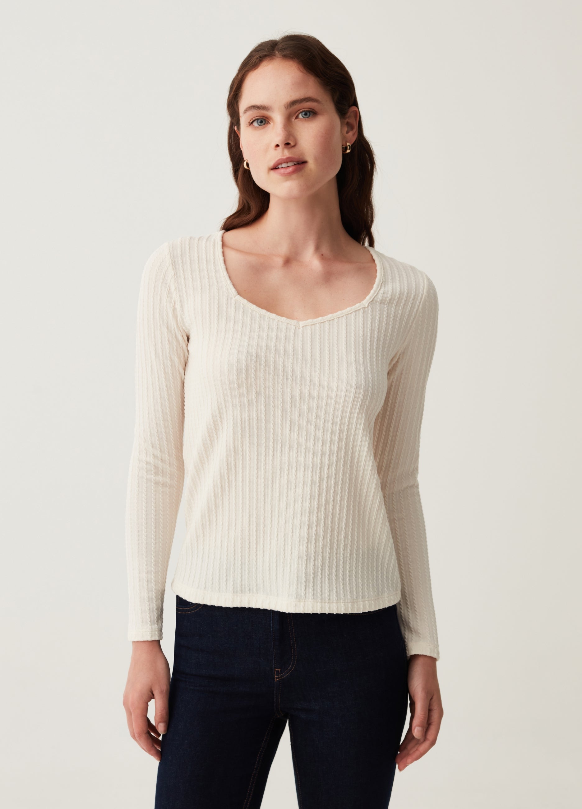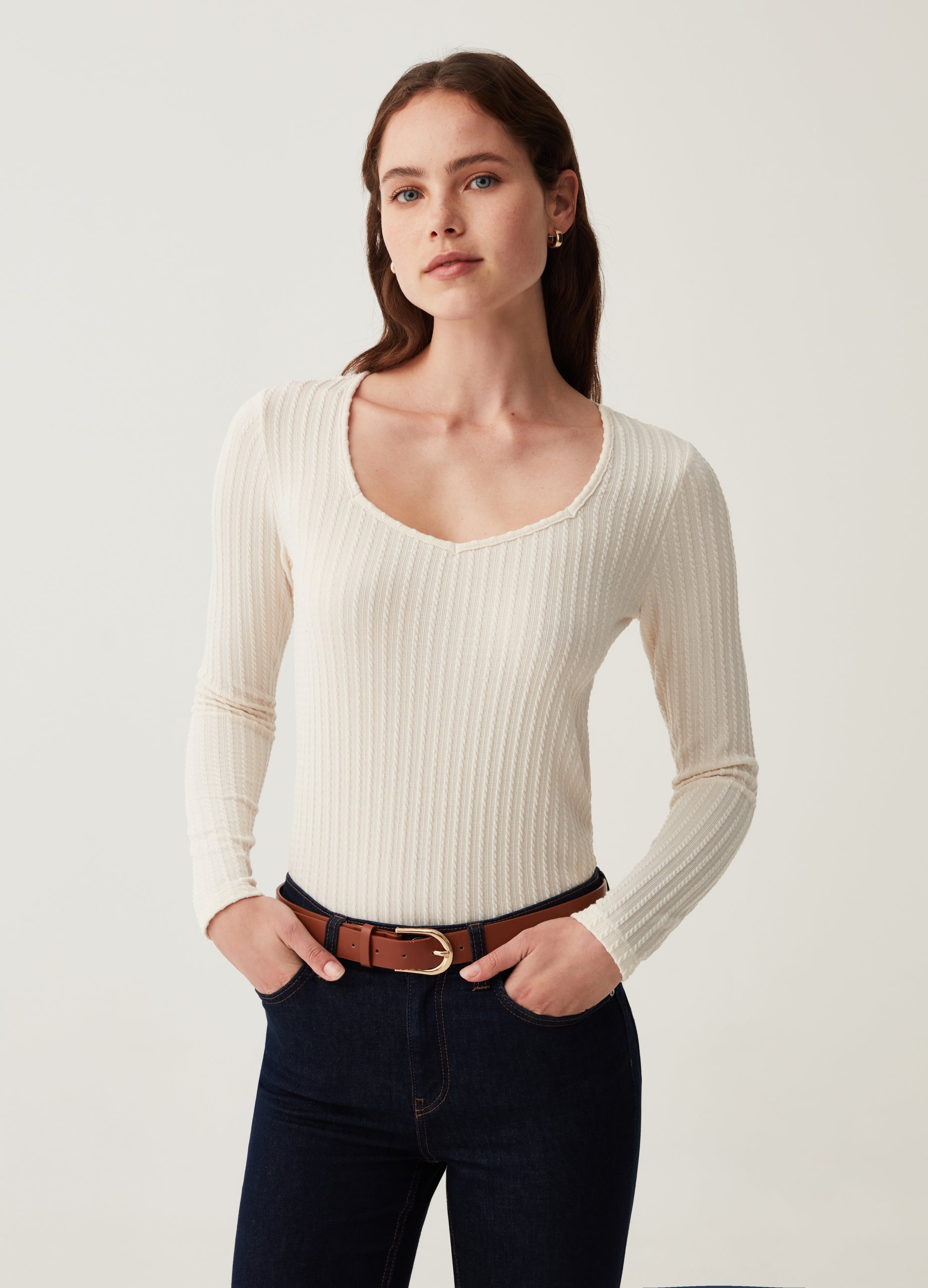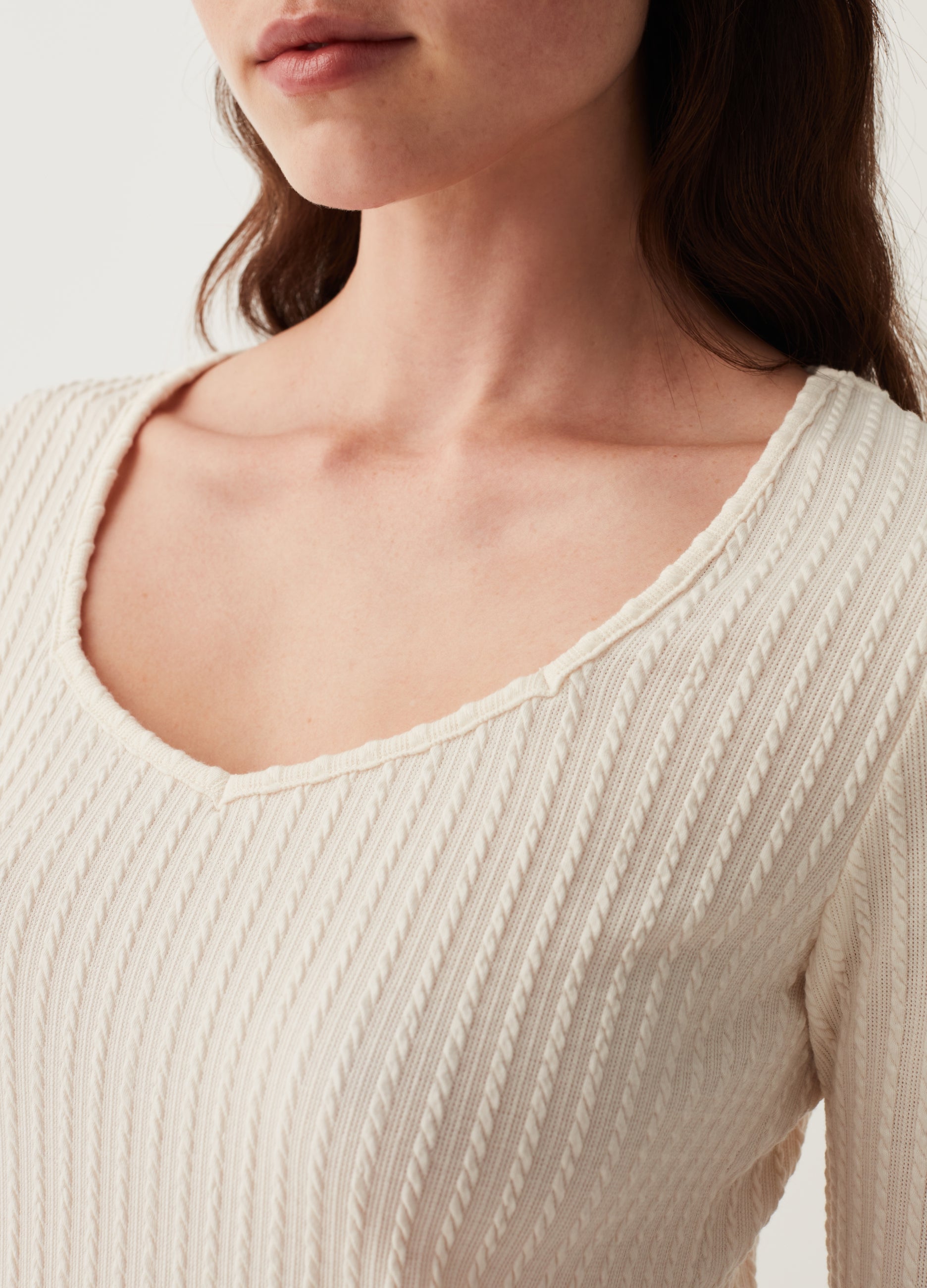 Stretch fabric long-sleeved T-shirt with braided design. Square neck.