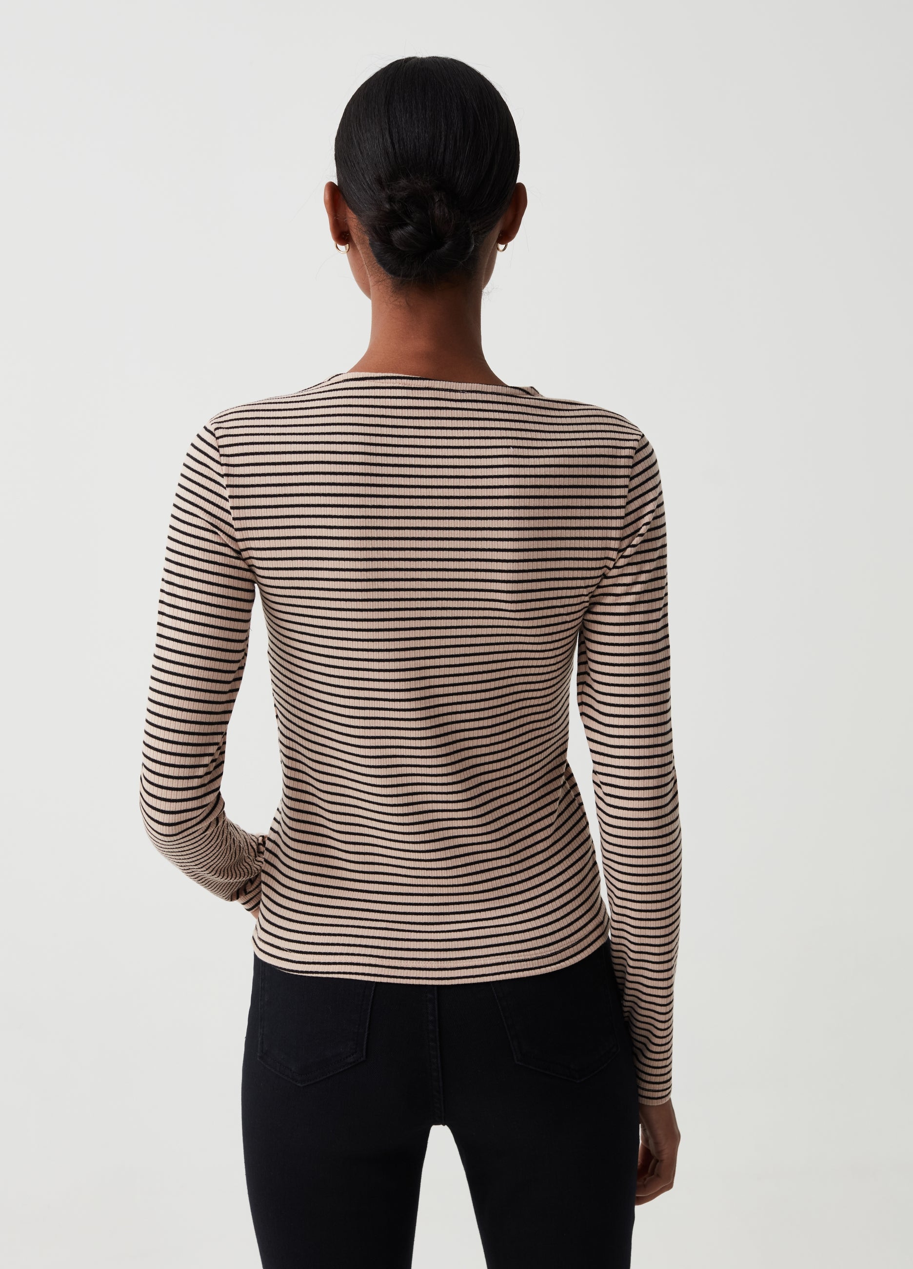 Long-sleeved T-shirt in stretch fabric with flat ribbing. Striped pattern. V neck with knot on the front.