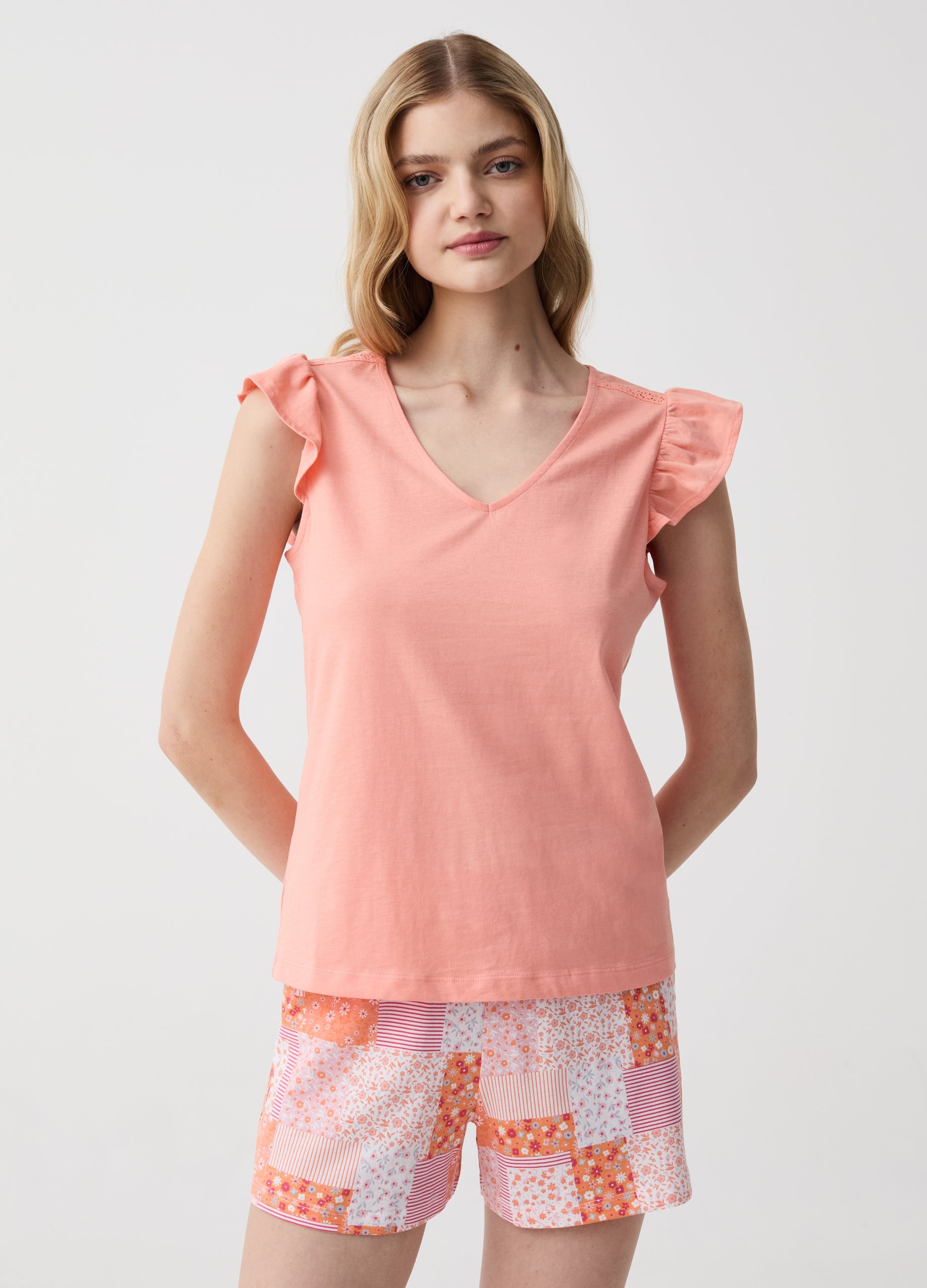 Short pyjamas in 100% cotton. Top with V neck. Flounces on the arm openings and lace insert on the shoulders. Shorts with elasticated waist band. Patchwork print with floral motif and all-over striped details.