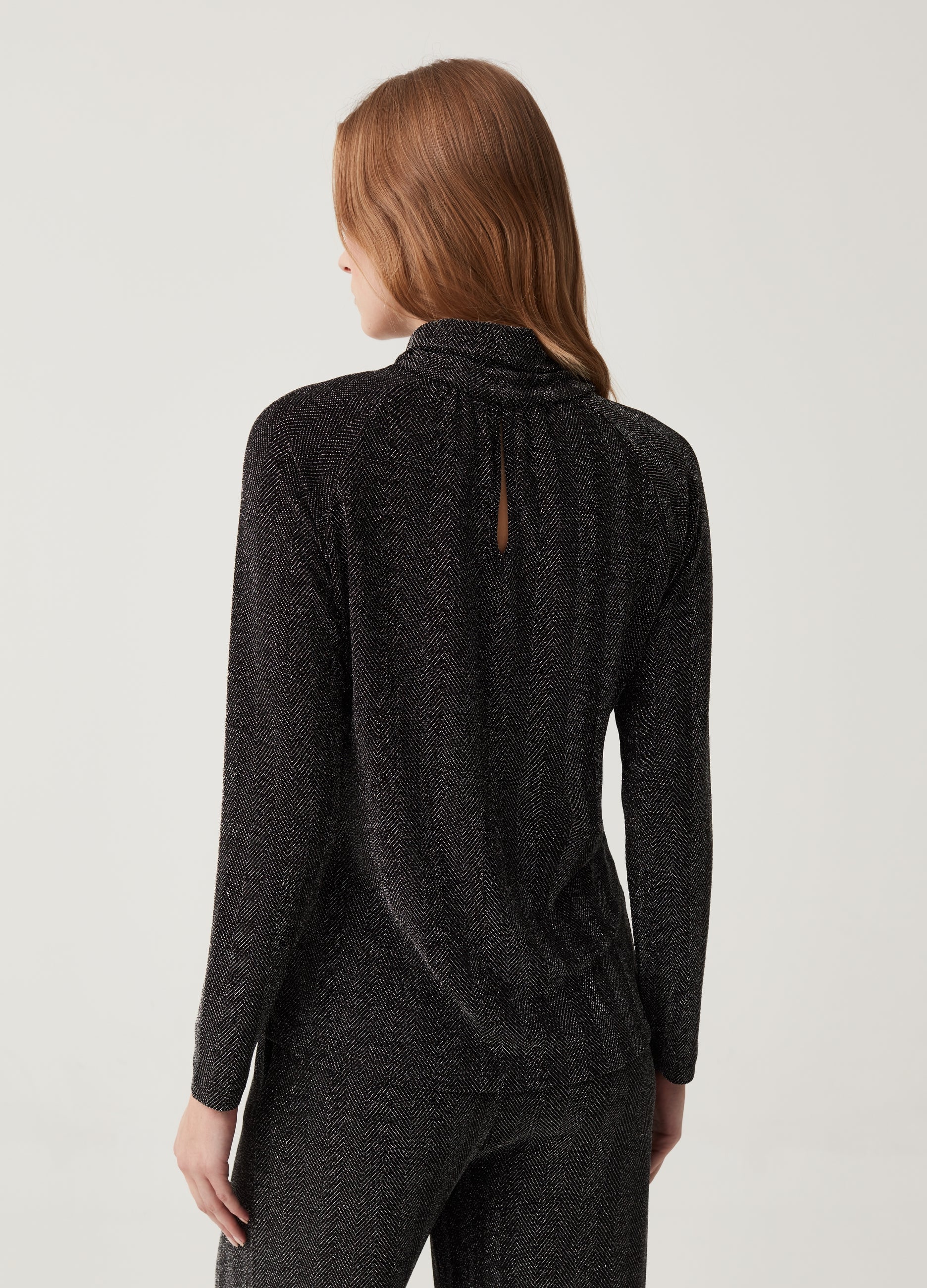 Stretch fabric T-shirt with lurex Herringbone weave. High neck with pleating on the front. Long raglan sleeves. Teardrop opening on back.