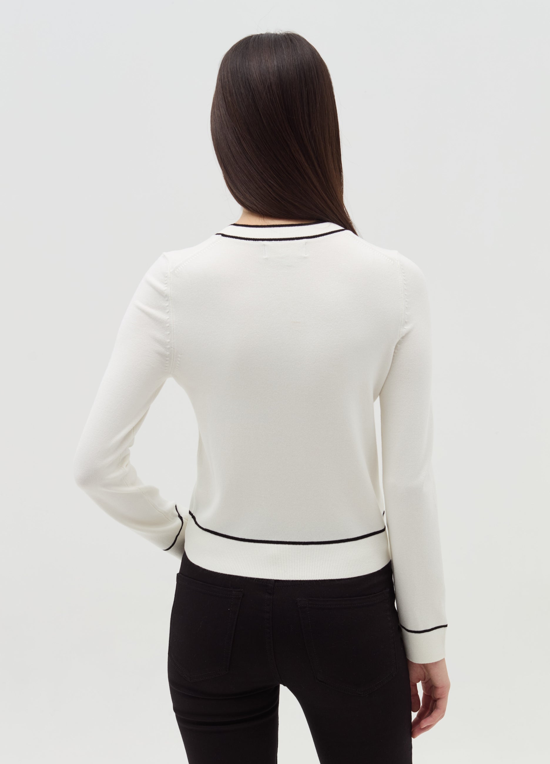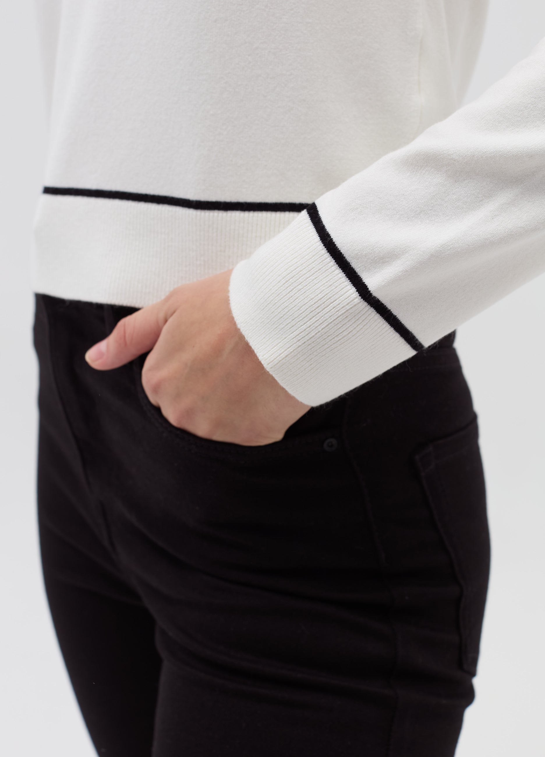 Pullover in FSC®-certified sustainable stretch viscose blend yarn with contrasting striped edging with ribbed trim. Round neck.