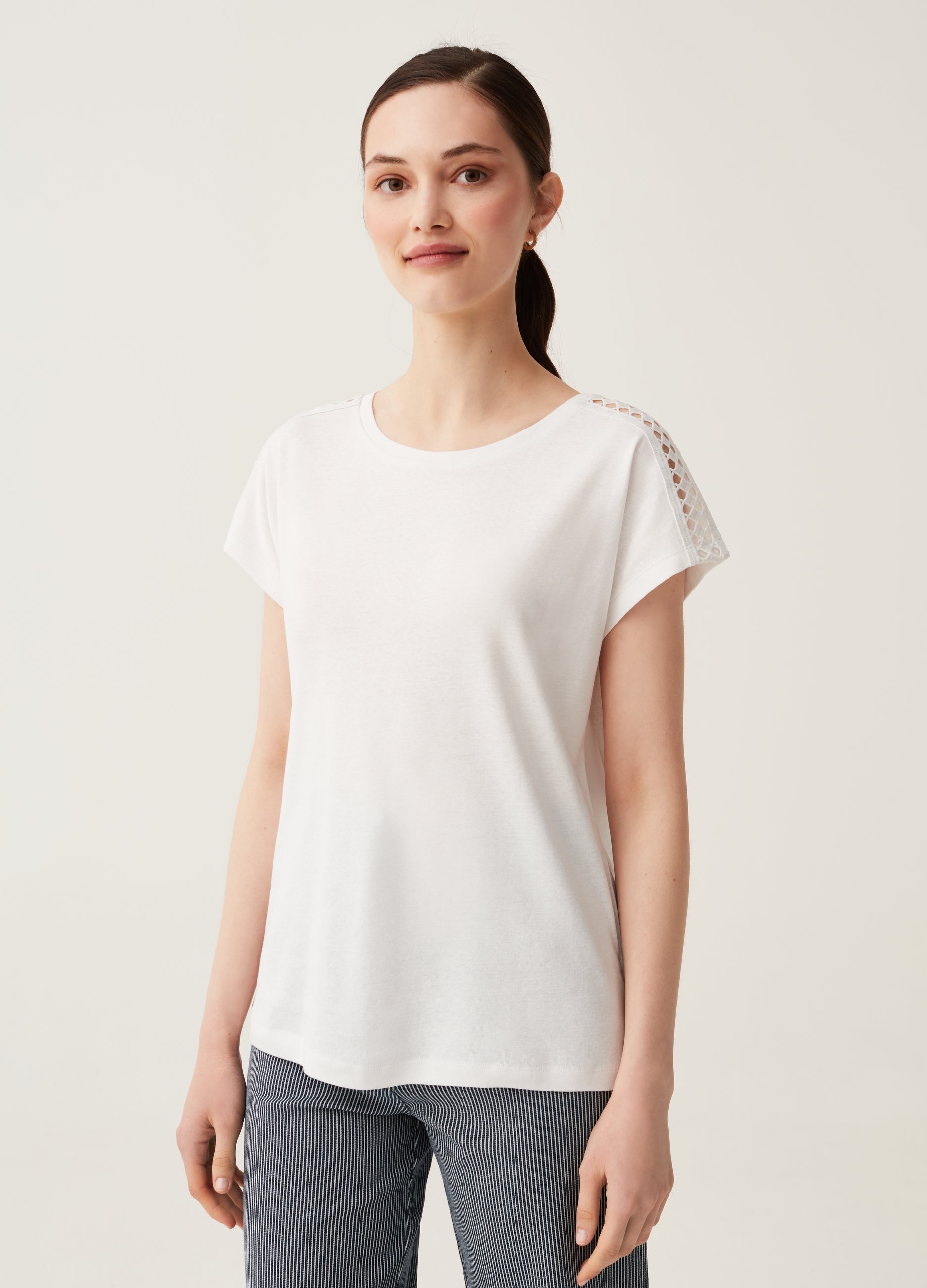 T-shirt in 100% cotton. Round ribbed neck. Kimono sleeves. Openwork insert in the shoulders.
