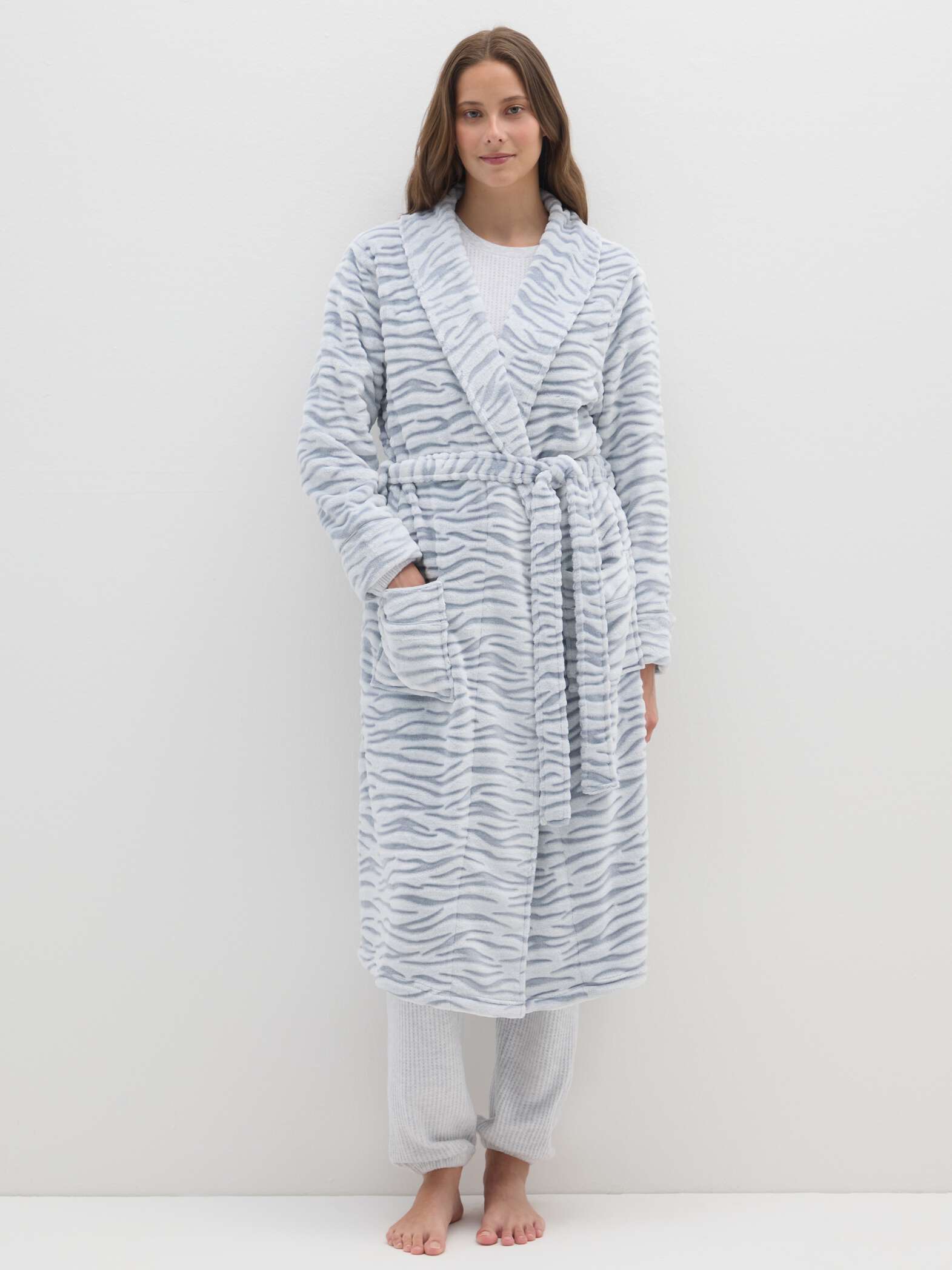 The multicolour dressing gown from the OVS line envelops the body for comfort. Decorated with a zebra pattern, it features practical pockets and a matching belt for a perfect fit. The long sleeves and cosy fabric make it ideal for relaxing at home.