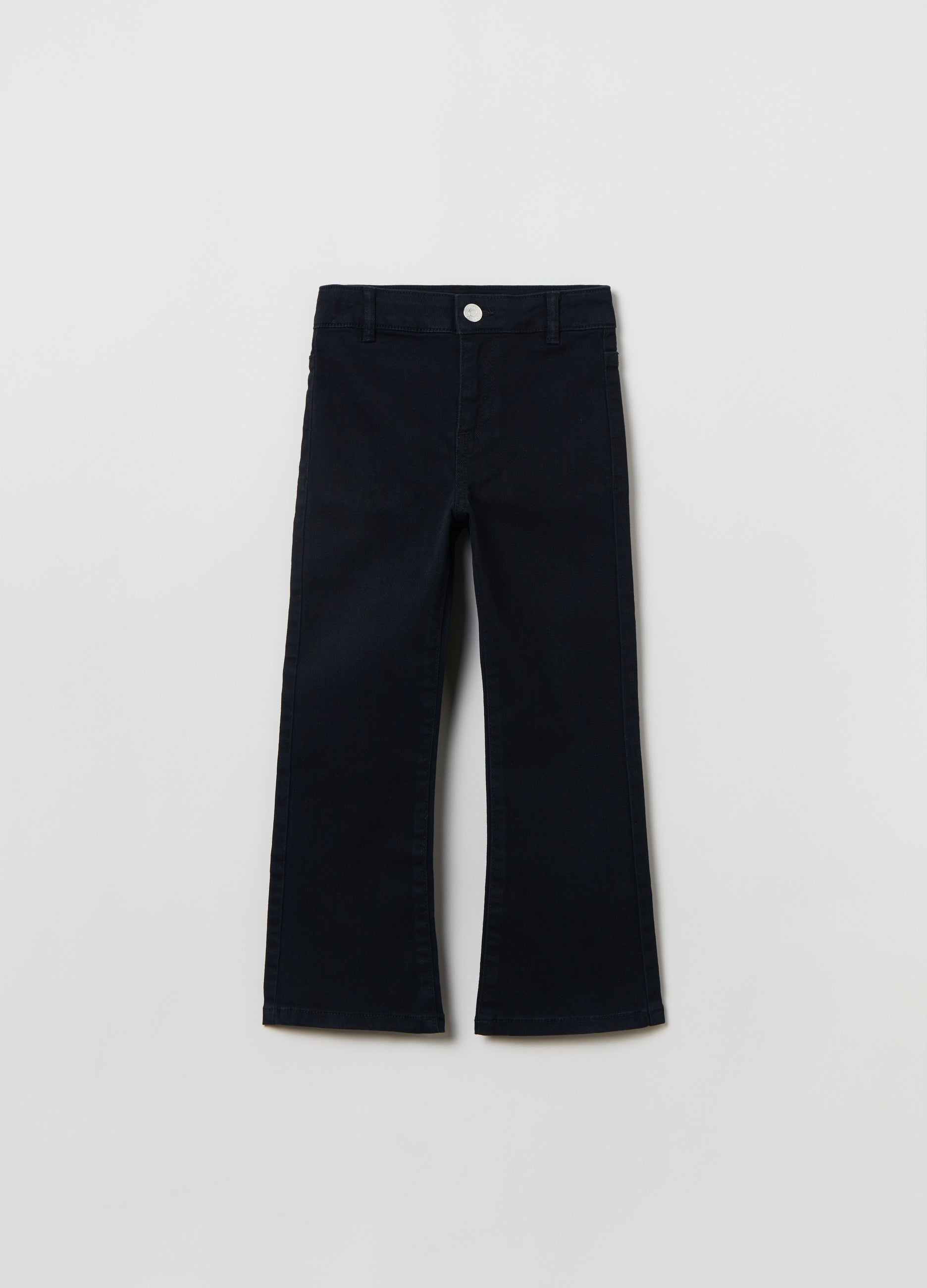 Flare-fit stretch cotton jeans. Two back patch pockets. Zip and button fastening.