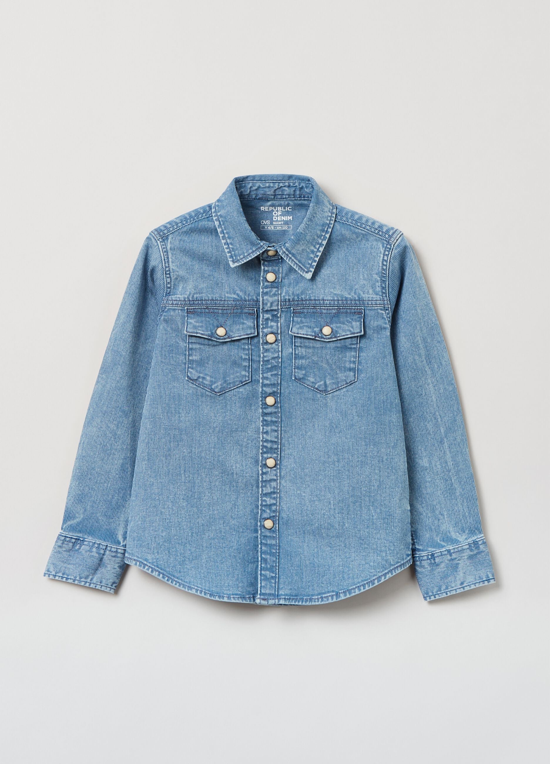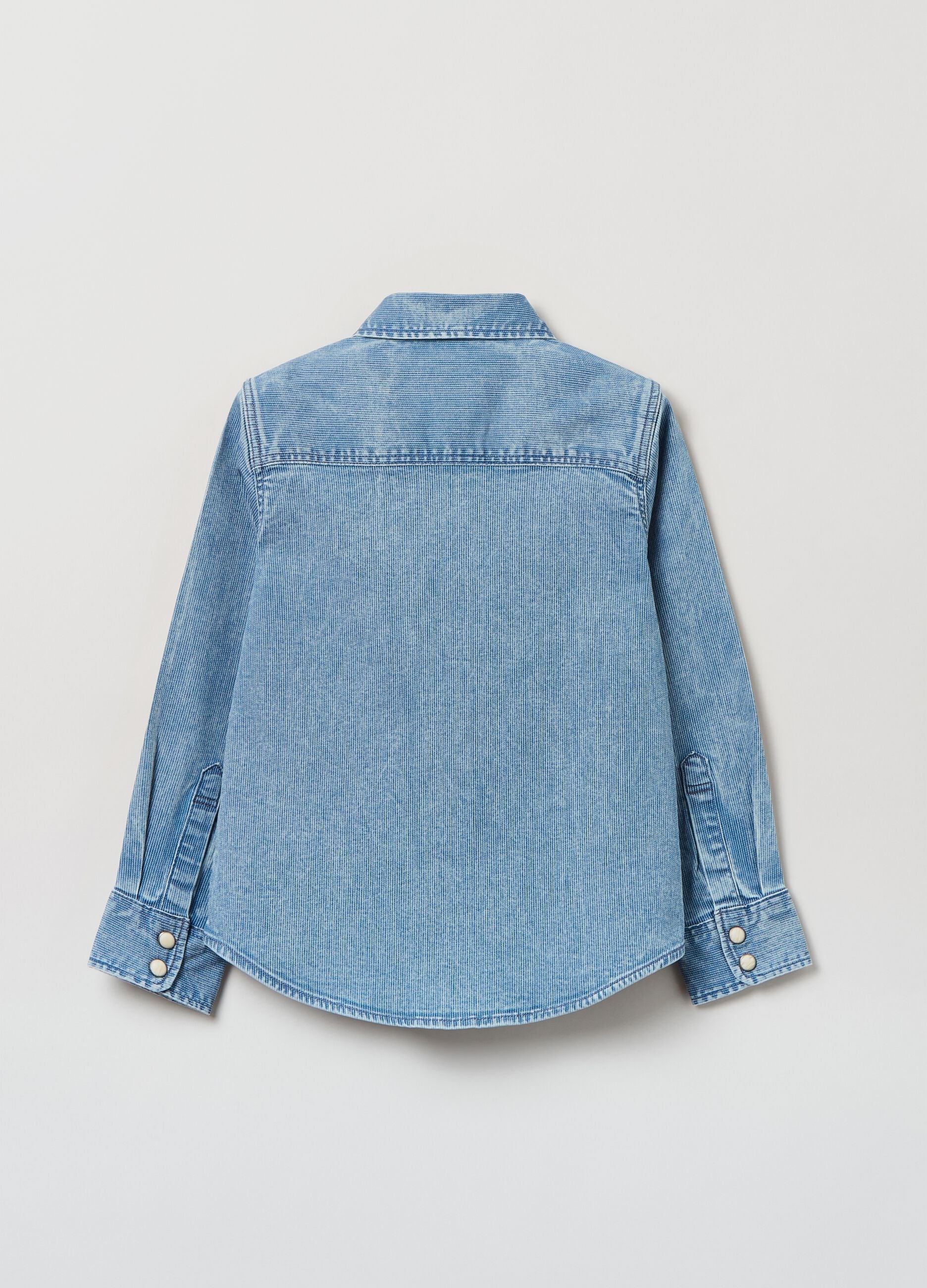 Stretch cotton denim shirt with striped weave. Bluff collar. Yoke on front and back. Two pockets with flaps and buttons. Mother-of-pearl-effect snap button closure.