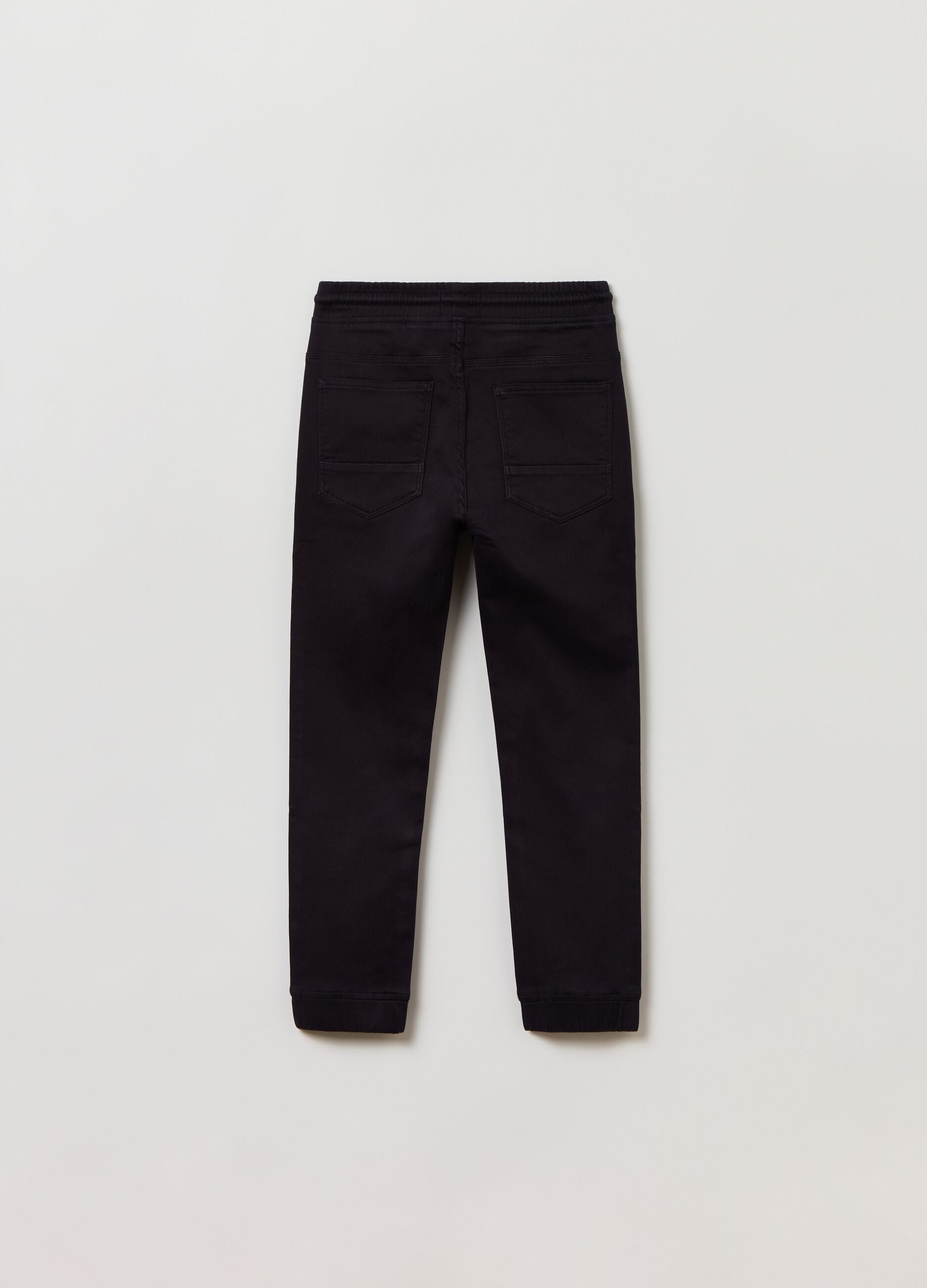 Cuff-hem trousers in stretch cotton French terry (non-brushed fleece lining) with drawstring. Two slant pockets and two patch pockets on the back. Elastic waist band and ankles.