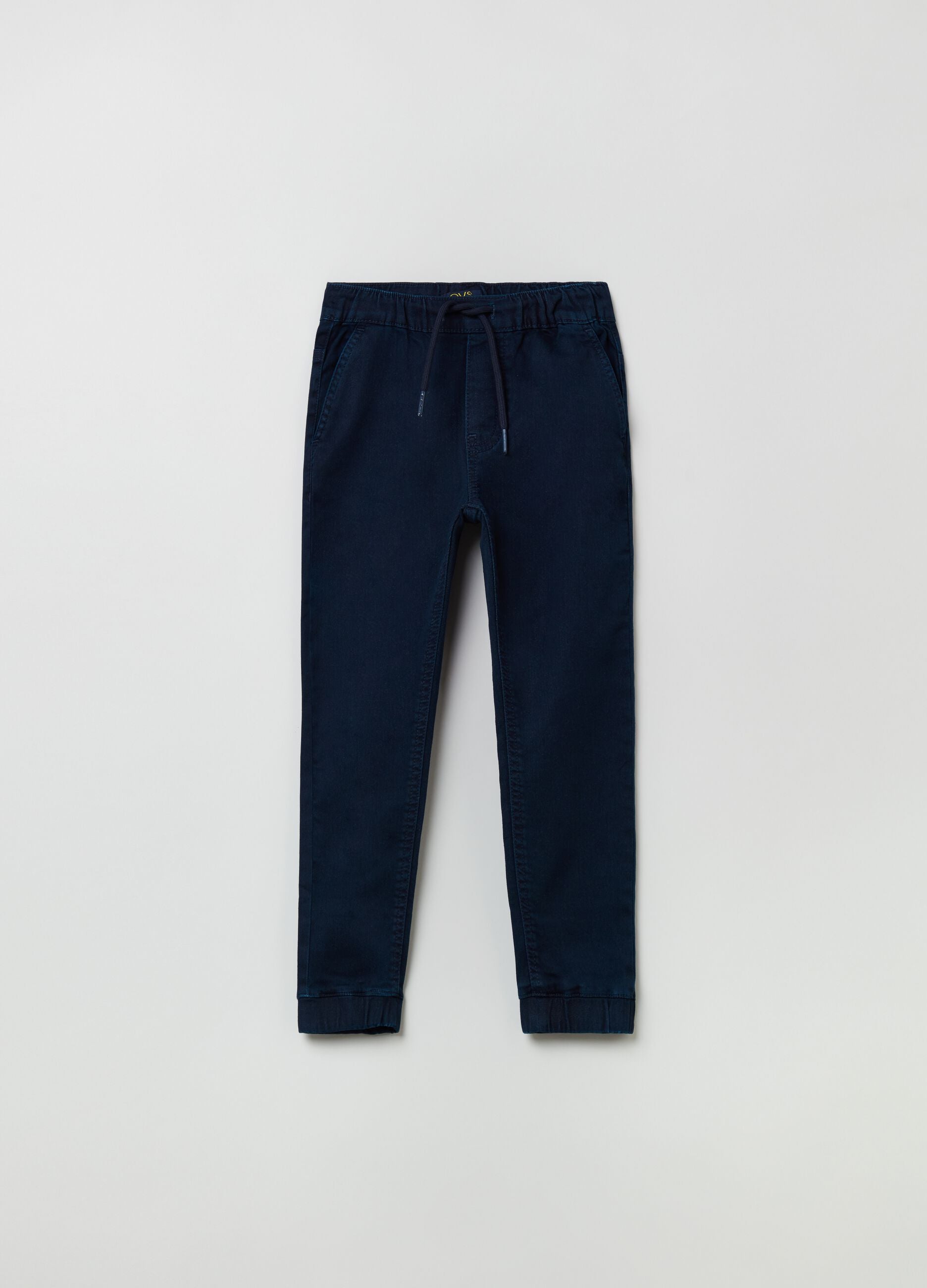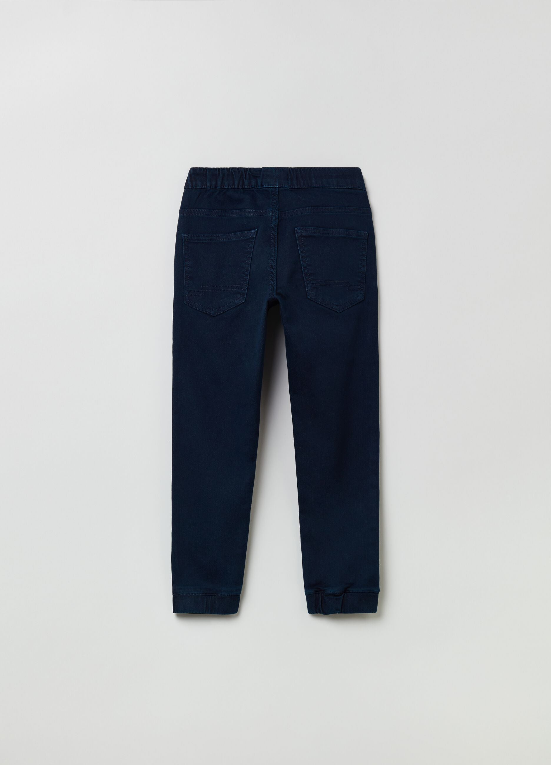 Denim French terry joggers (non-brushed lining) in stretch cotton blend. Elasticated waist with drawstring. Two slant pockets and two patch pockets on the back. Elasticated ankles.