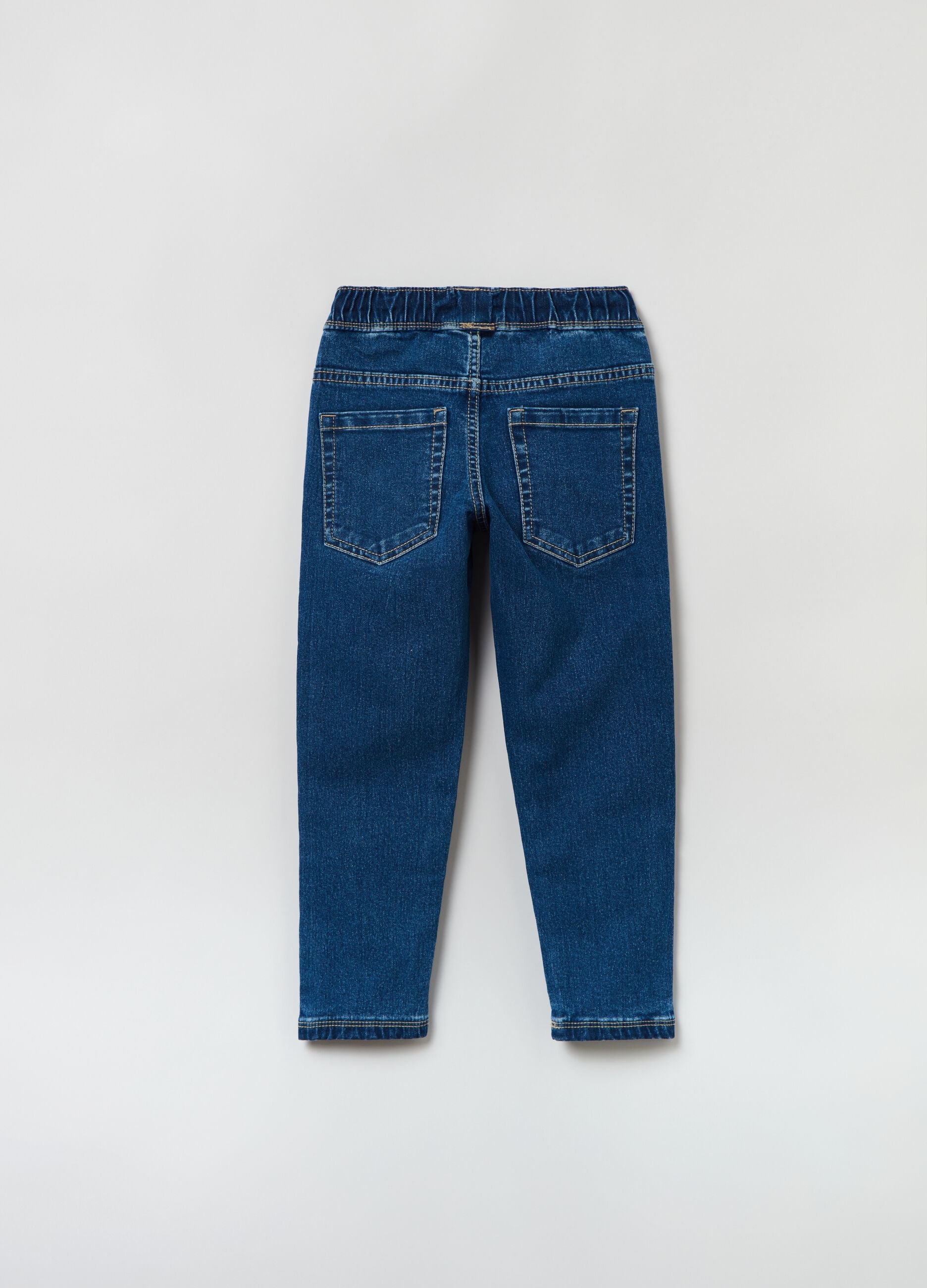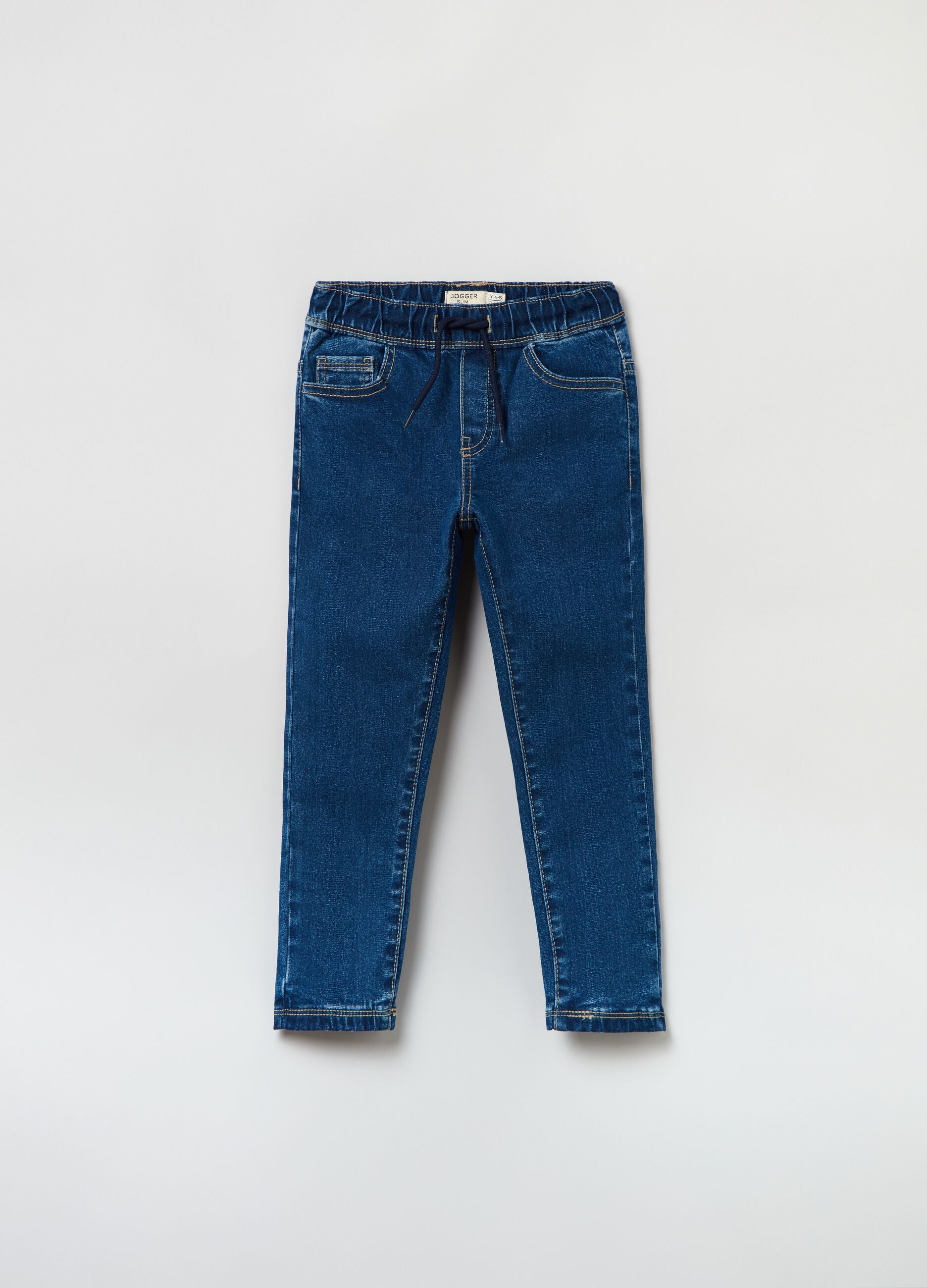 Slim-fit joggers in stretch cotton blend denim. Elastic waistband with drawstring. Five pockets.