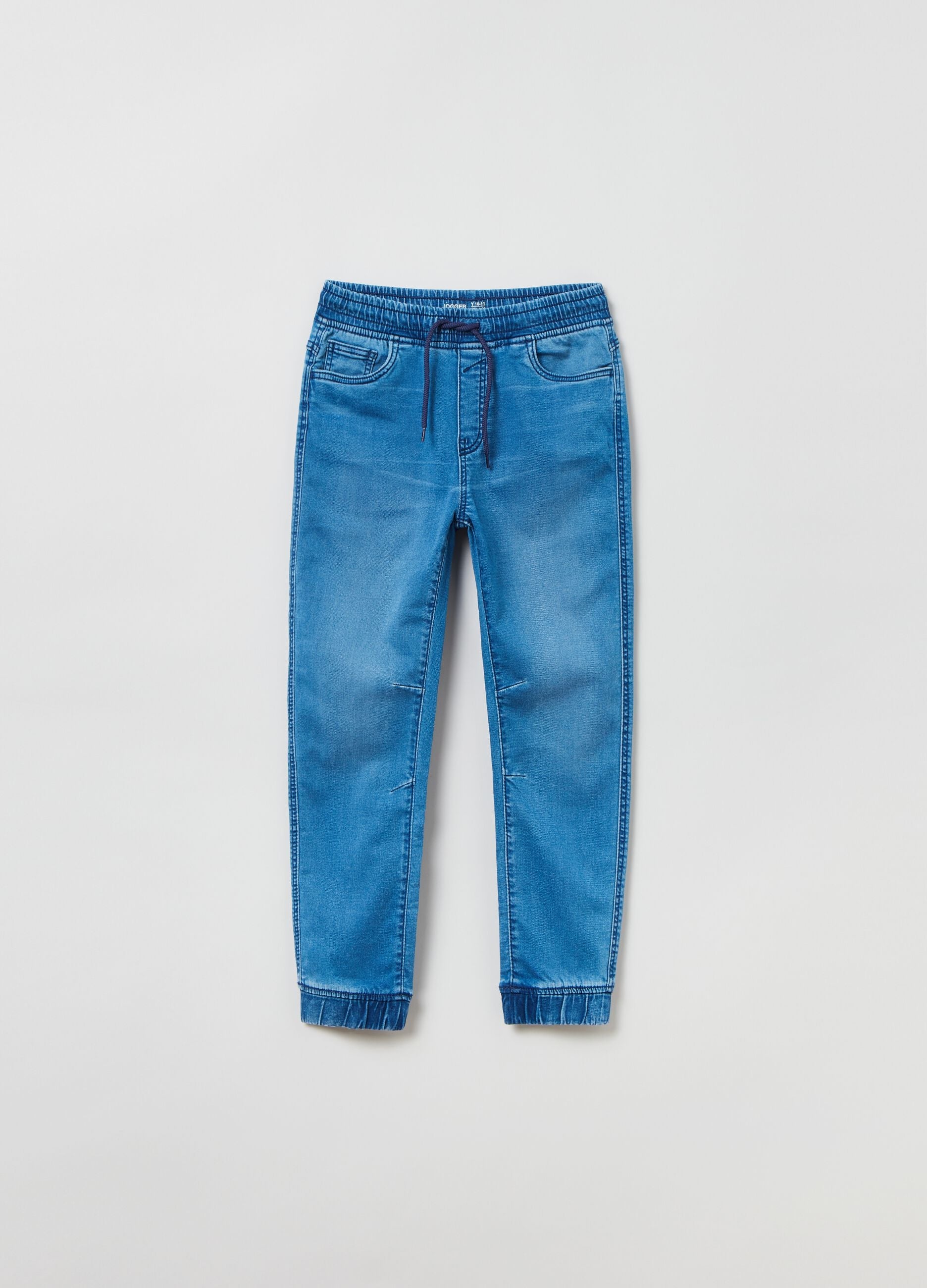 Misdyed-effect stretch cotton denim joggers with drawstring. Two side welt pockets and coin pocket. One back patch pocket. Elastic waist band and ankles.