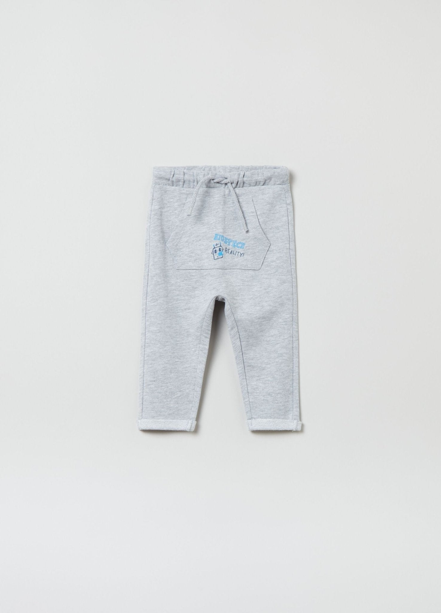 Viscose and cotton French terry joggers (non-brushed fleece lining) with drawstring. Pouch pocket with robot and lettering print.
