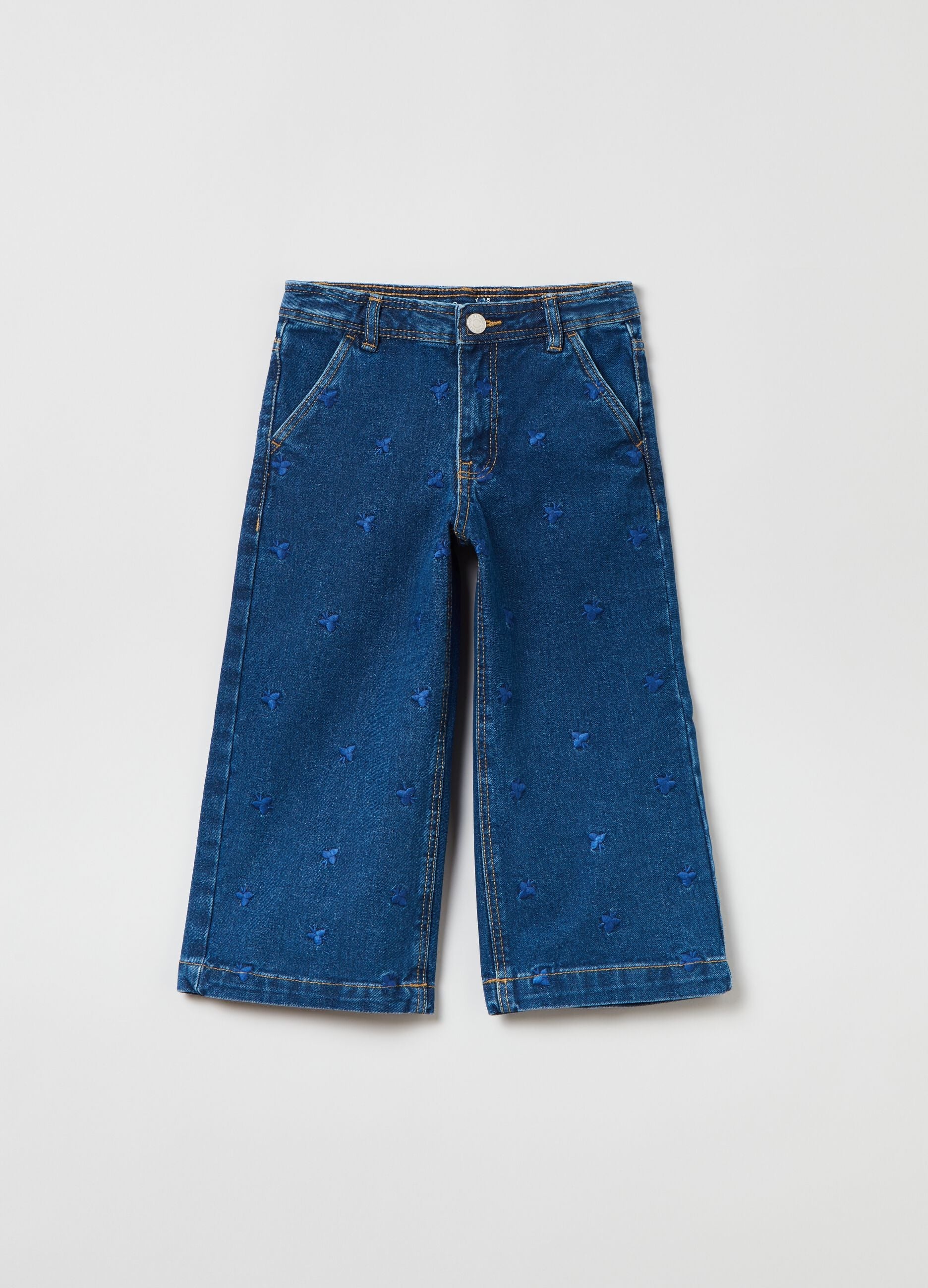 100% cotton wide-leg jeans. Two slant pockets and two patch pockets on the back. Butterfly embroidery on the front. Zip and button fastening.