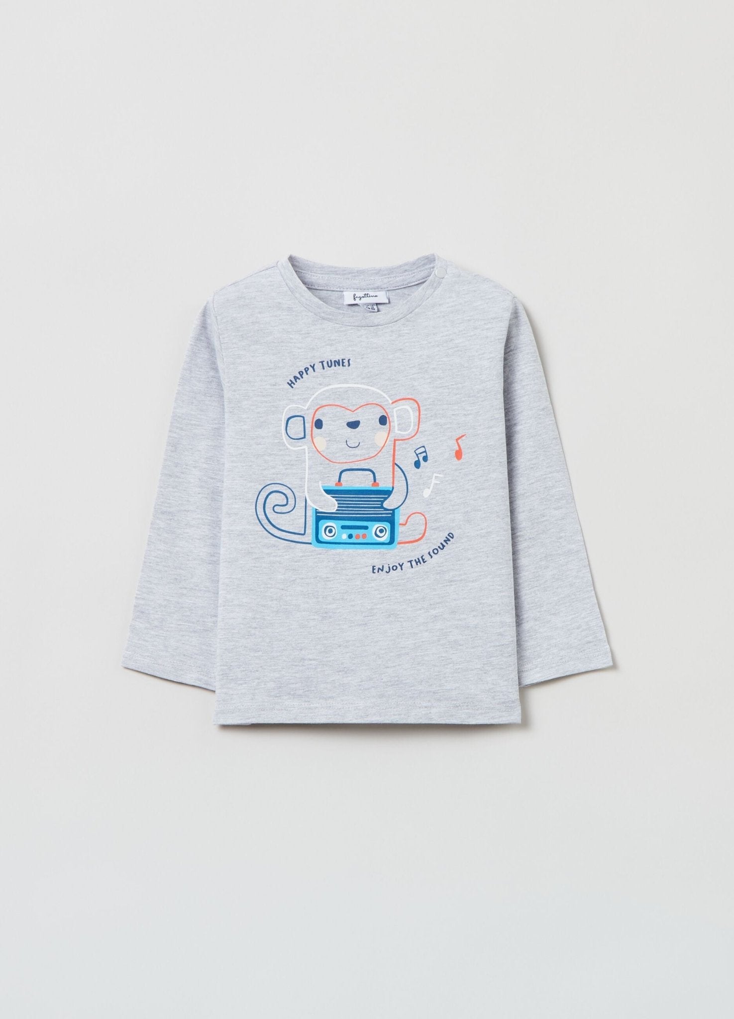 Cotton and viscose T-shirt with long sleeves. Round neck with snap buttons on the shoulder. Stereo and lettering print on the front.