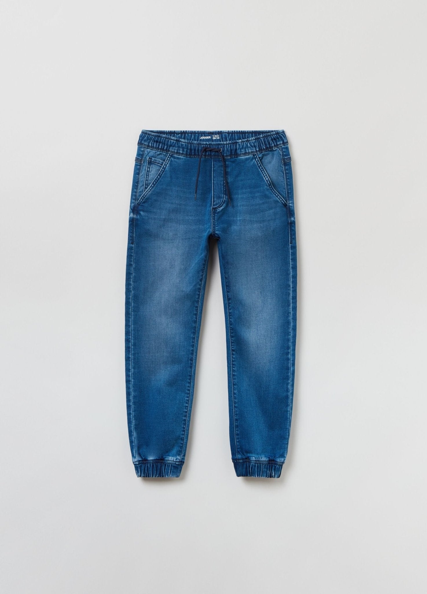 Stretch cotton denim joggers with fading. Five pockets. Elastic waist band and ankles.