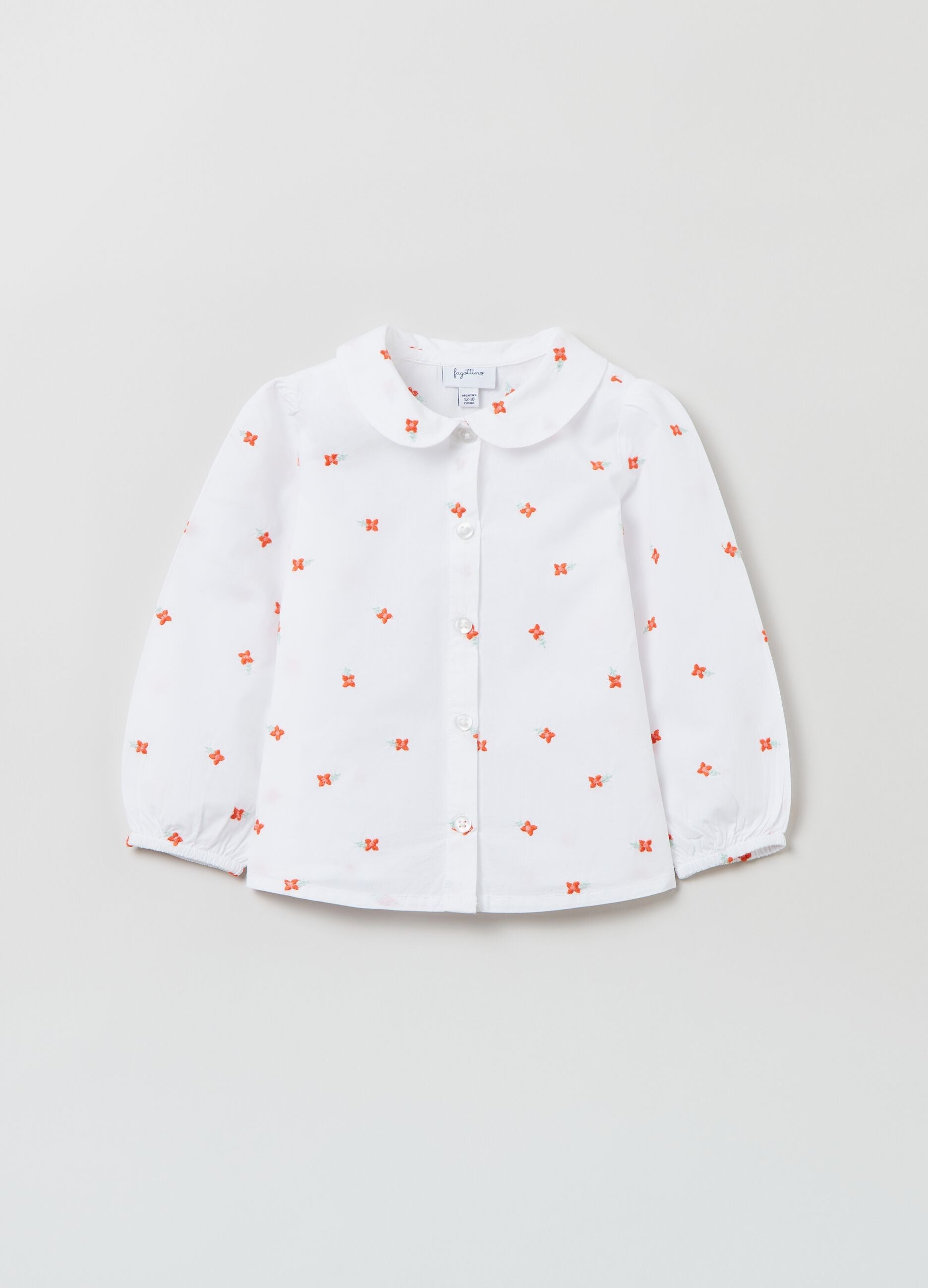 100% cotton shirt with all-over small flowers print. Rounded collar. Long sleeves with elasticated cuffs. Button fastening.
