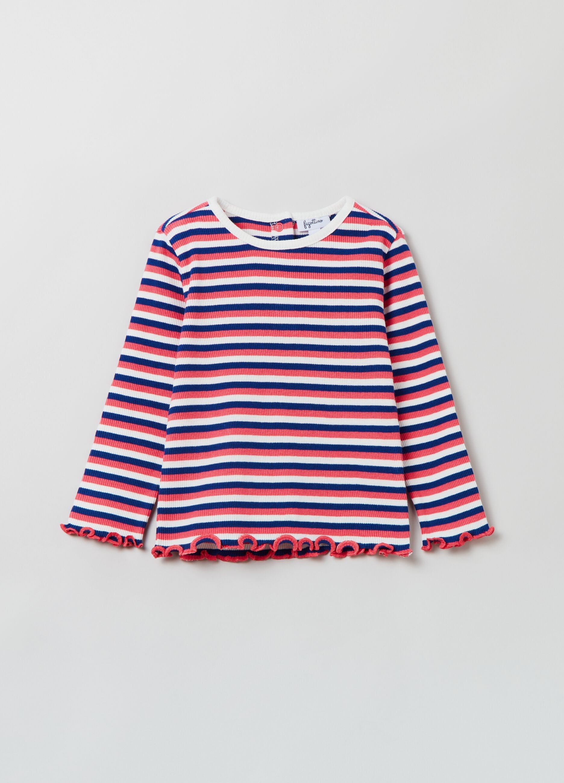 Long-sleeved ribbed T-shirt in 100% cotton. Round neck and snap buttons on the back. Multicoloured striped print. Gathered trim.
