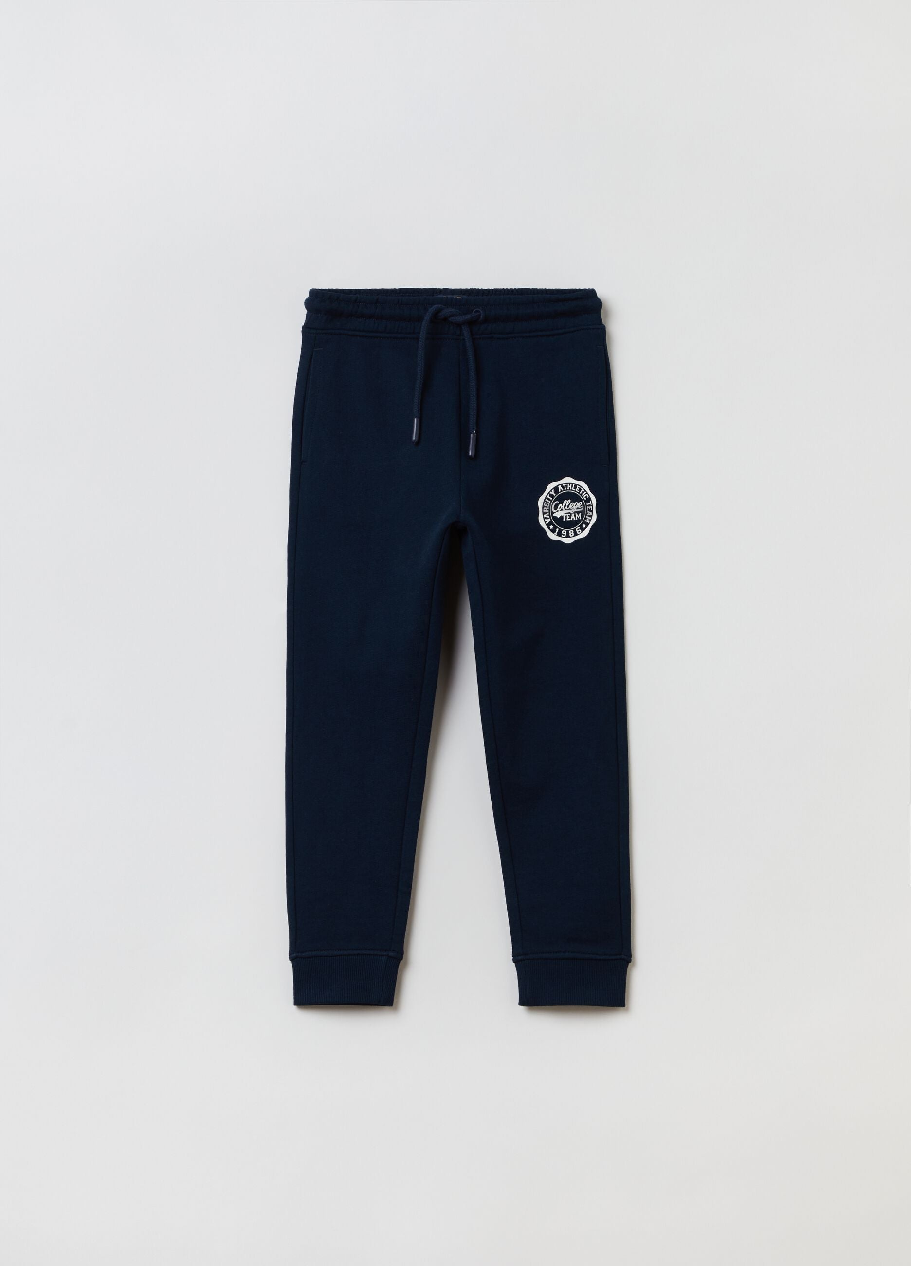 Plush joggers in 100% cotton with drawstring Two vertical pockets and one patch pocket on the back. College crest print on the side. Ribbed ankle cuffs.