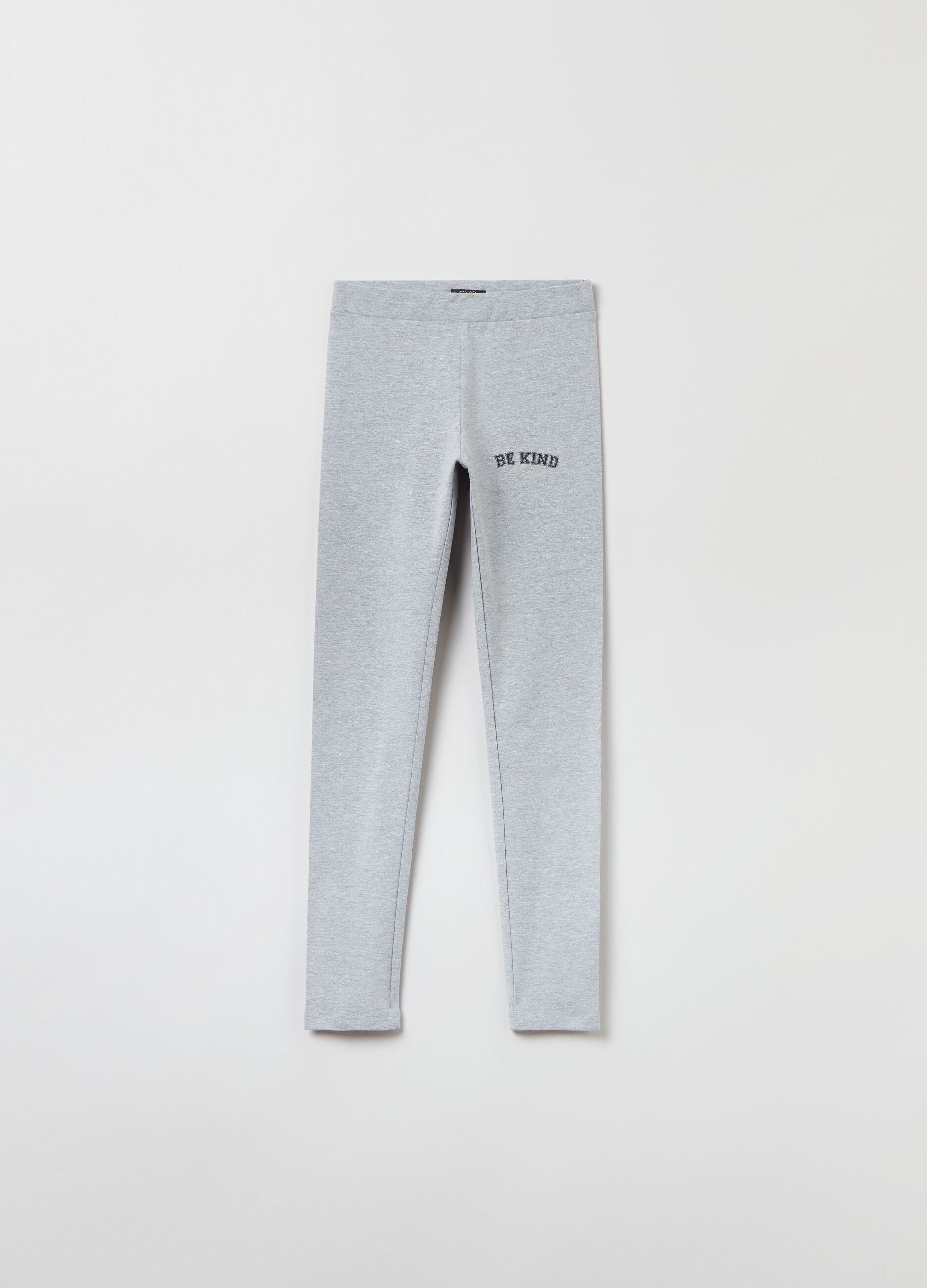 Stretch cotton blend leggings with elastic waistband. Printed lettering on the side.