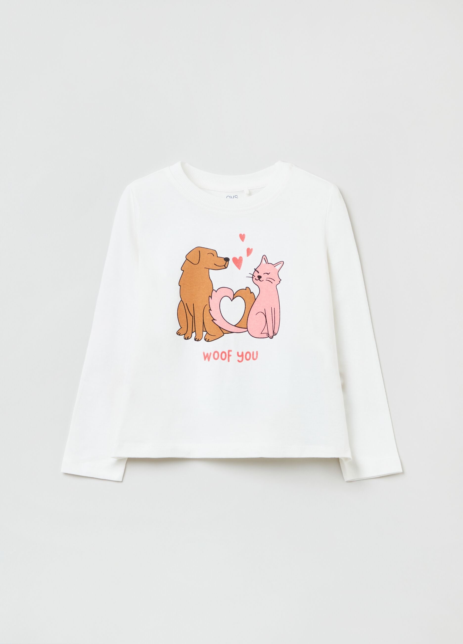Long-sleeved T-shirt in 100% cotton. Round ribbed neck. Pup and kitten in love print with hearts and glitter lettering.