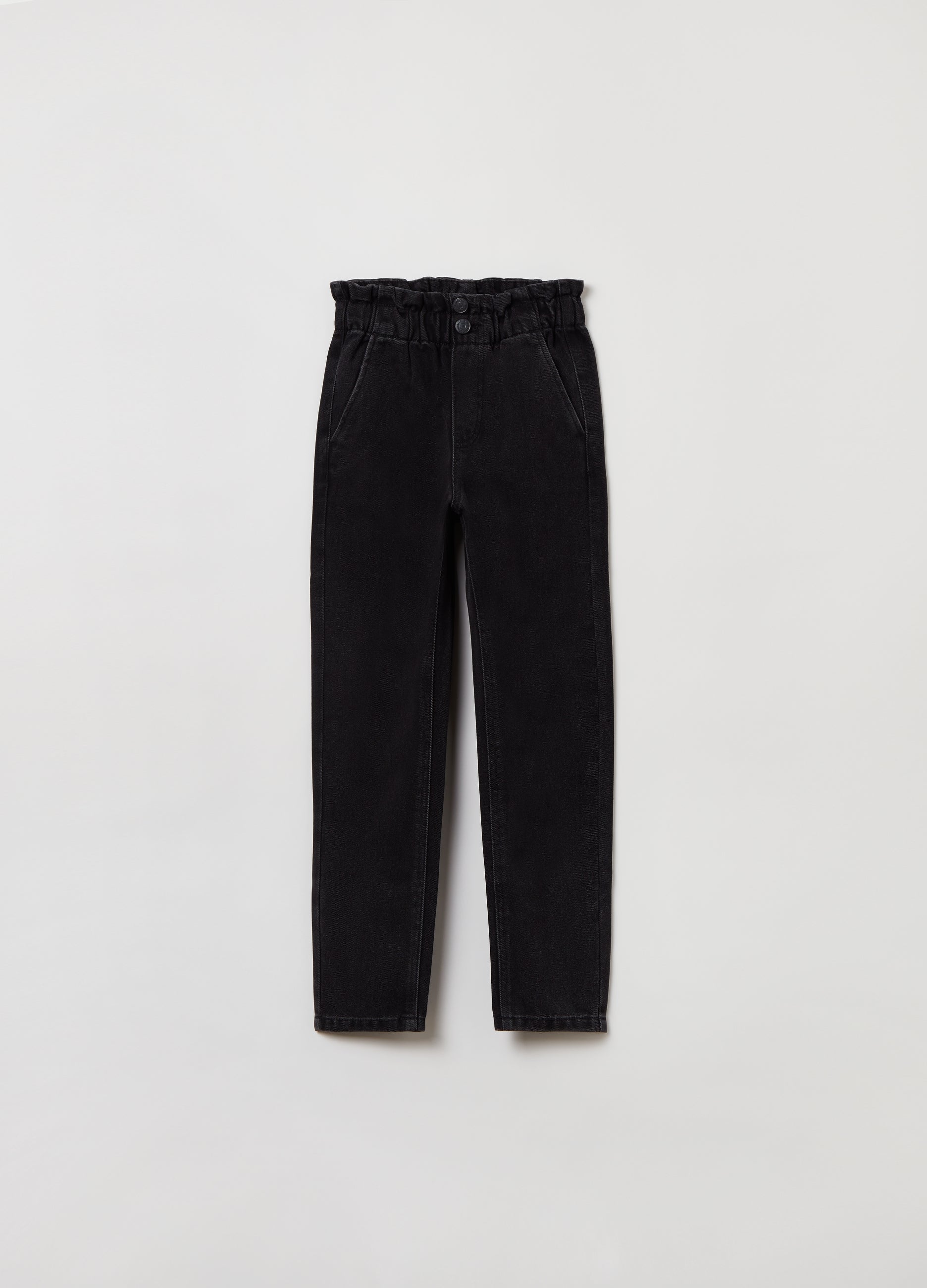 Paper bag jeans in cotton blend. Elasticated waist. Two front and two back patch pockets. Zip and double button fastening.