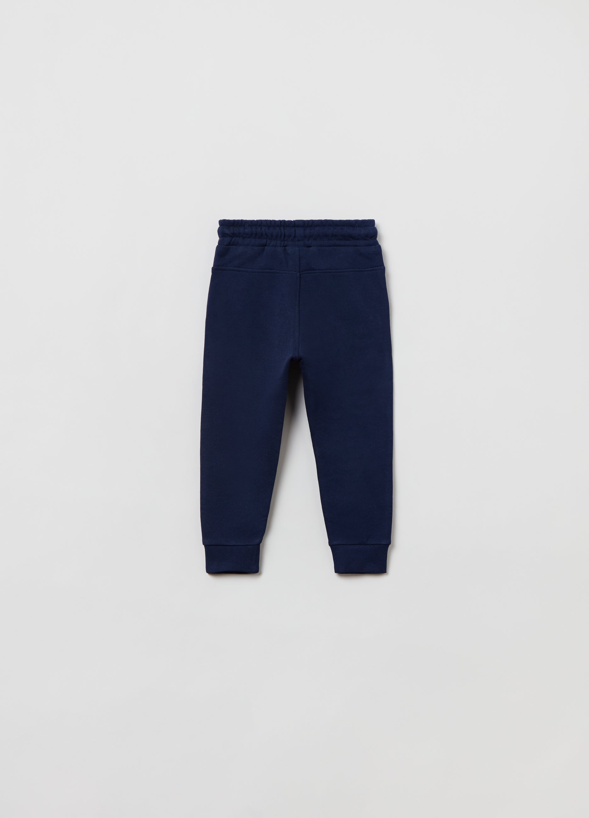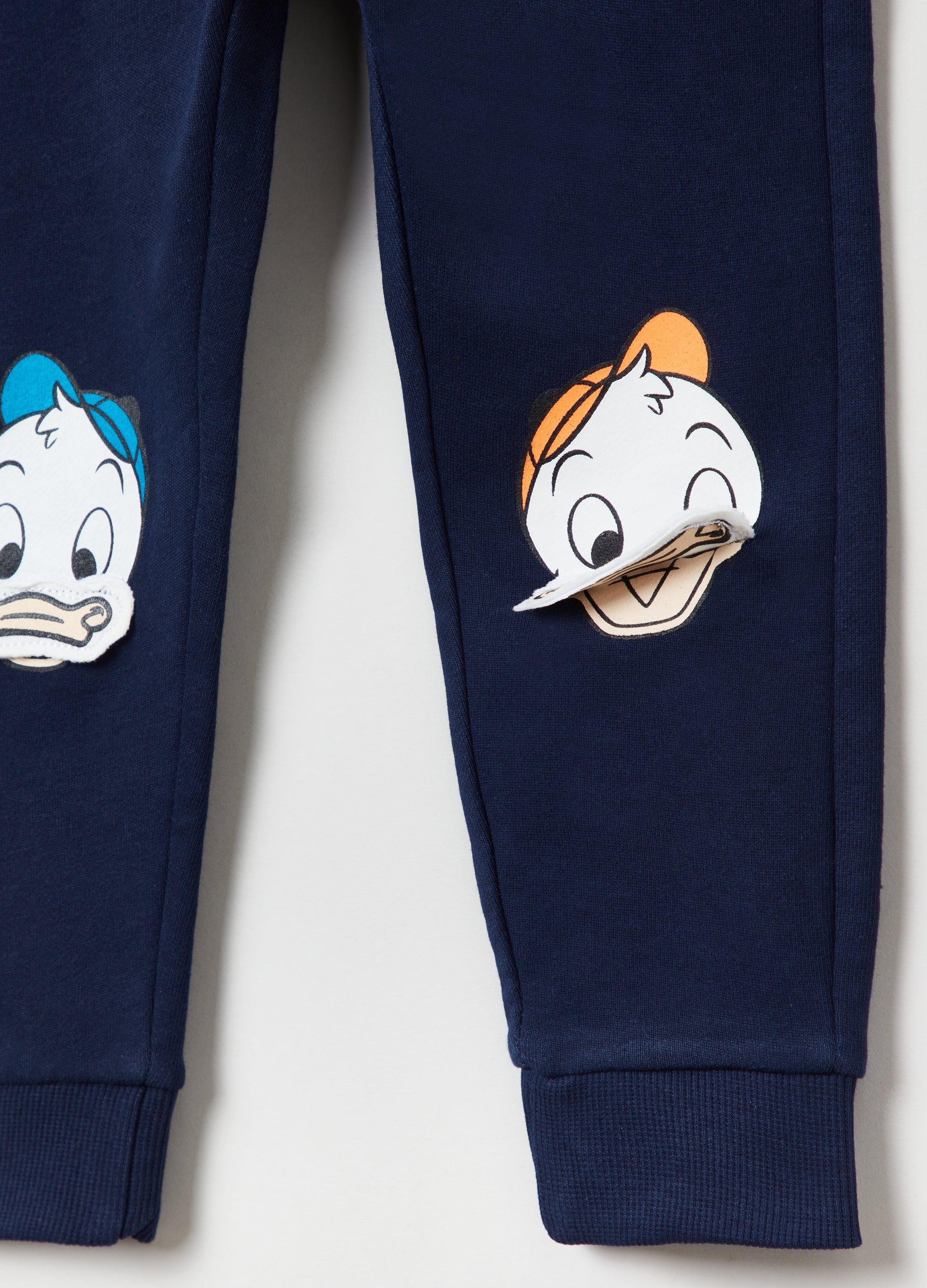 Joggers in lightweight 100% cotton plush with drawstring. Two front pockets. Disney Baby Huey, Dewey, and Louie with beak appliqué on the knee. Ribbed ankle cuffs.