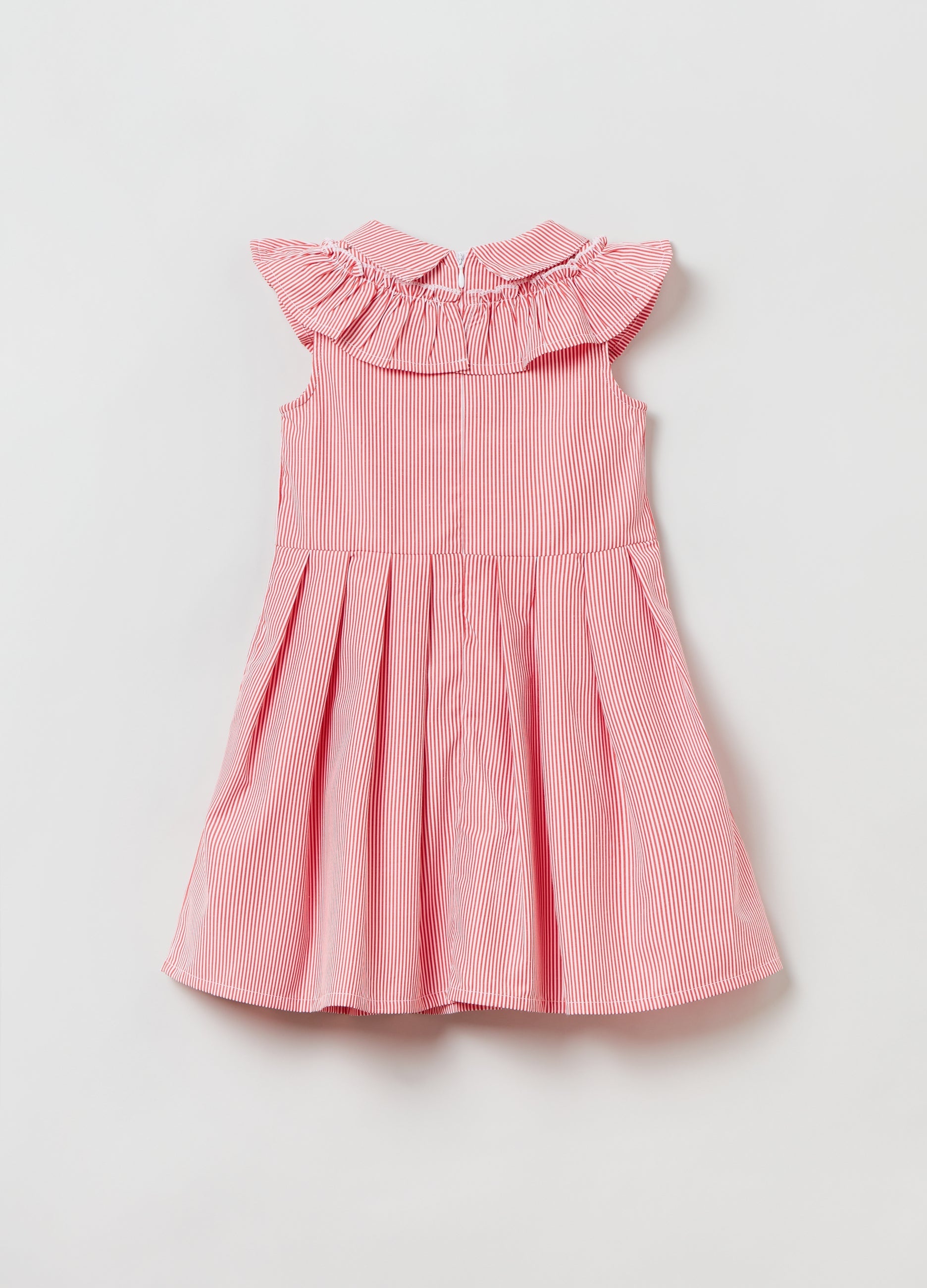 Sleeveless dress in cotton blend with pleated skirt. 100% cotton lining. Striped pattern. Bluff collar with flounce appliqué. Zip fastening on the back.