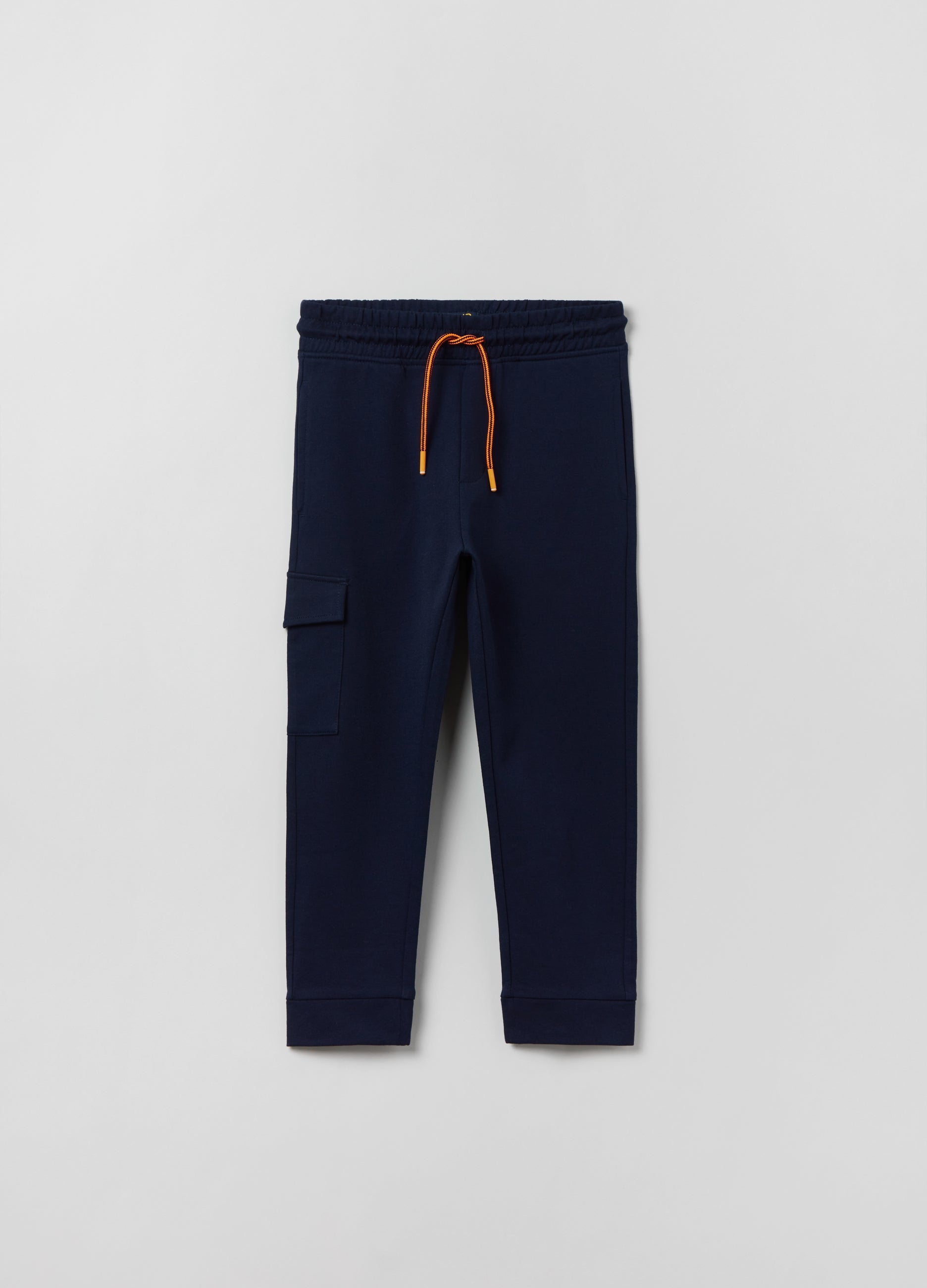 100% cotton plush joggers with two-tone drawstring. Two vertical pockets and one side pocket with flap.