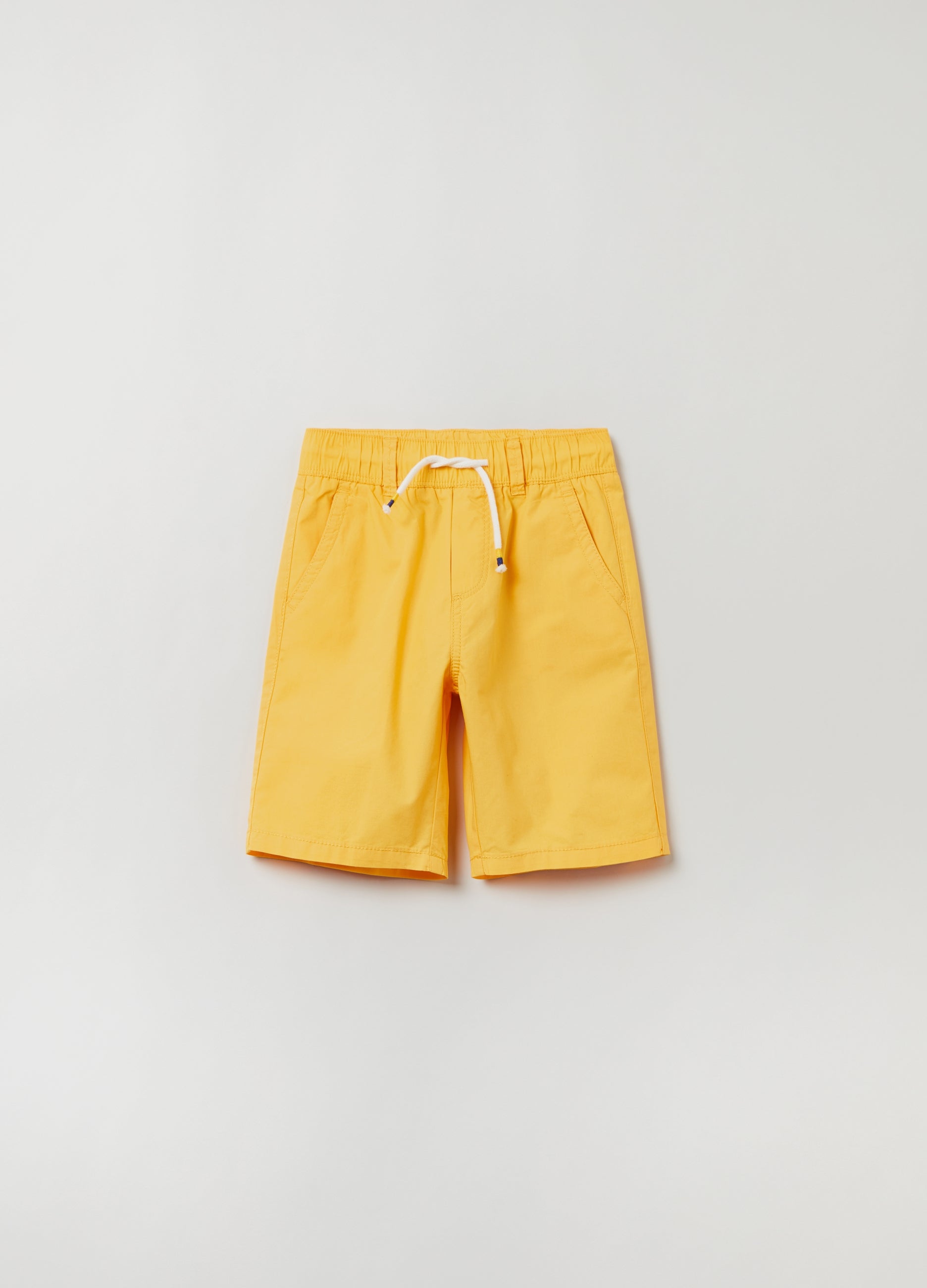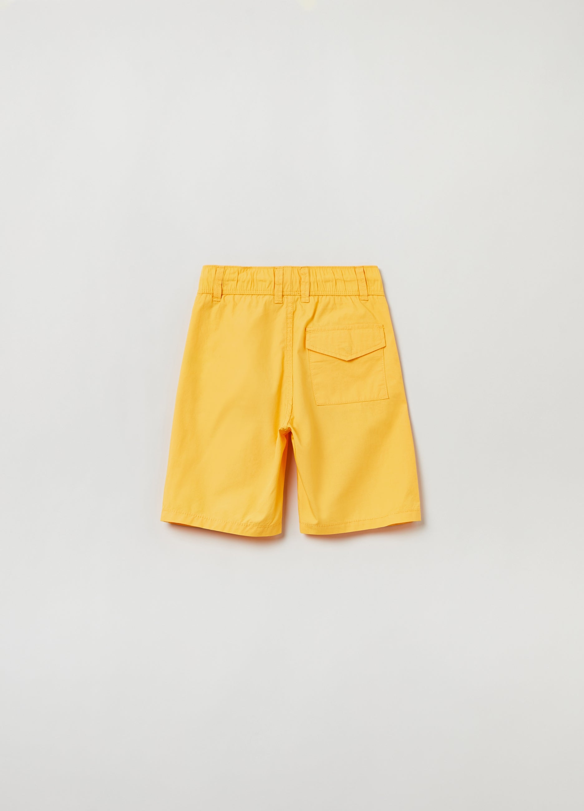 Solid colour 100% cotton Bermuda shorts. Elastic waistband with drawstring. Two slant pockets and two patch pockets with flap on the back.