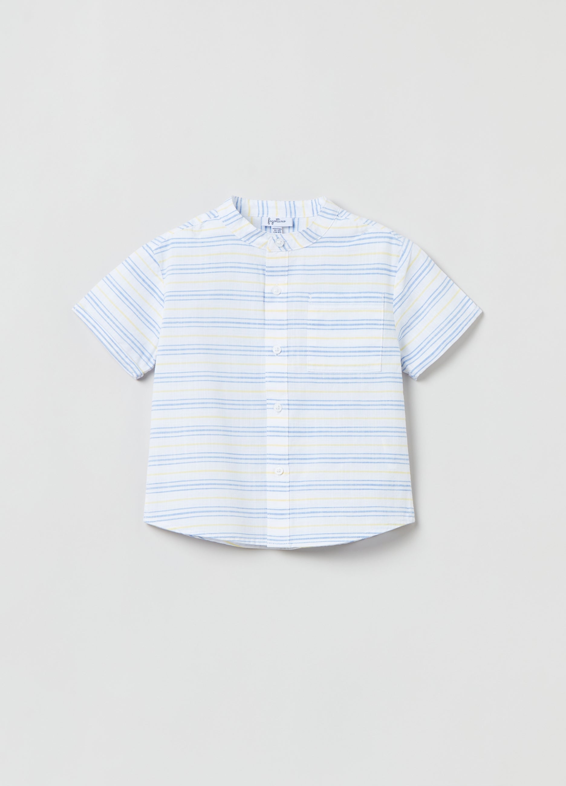 Iridescent-effect 100% cotton shirt. Yarn-dyed striped pattern. Band collar and yoke on the back. Patch pocket on the chest. Button fastening.