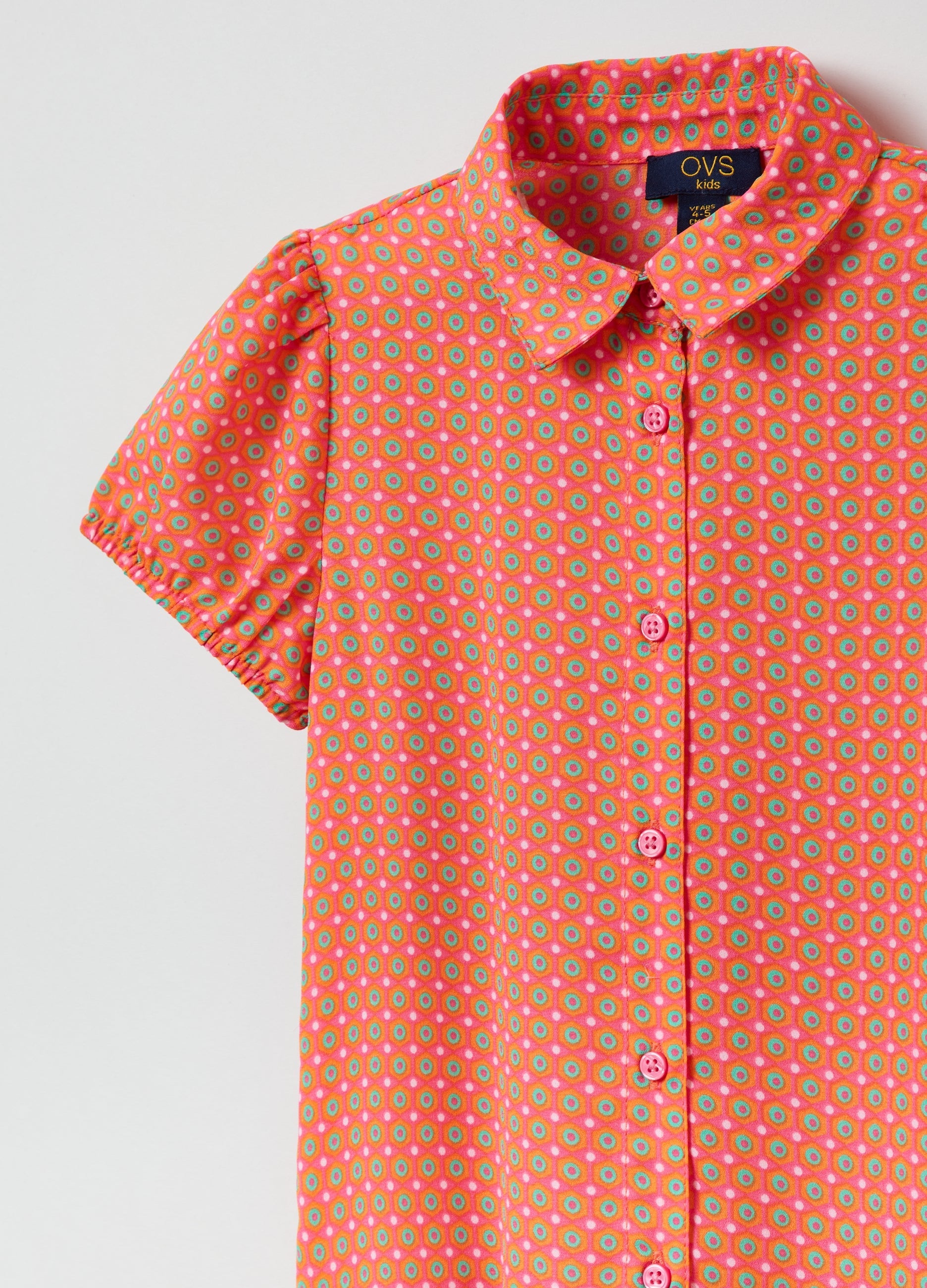 Shirt dress with peplum hem. Short puff sleeves with elasticated cuffs. All-over geometric print.