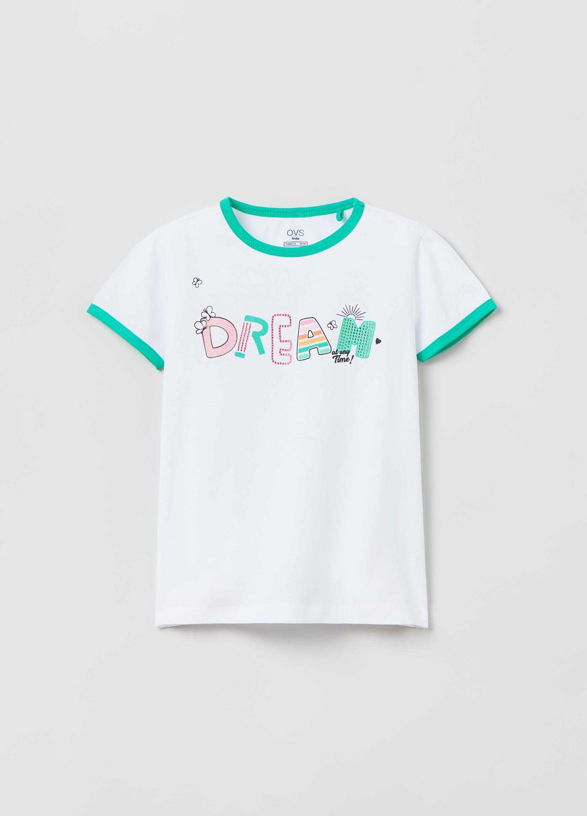 Stretch cotton T-shirt. Round neckline. Printed writing with glitter letter and diamanté appliqués.