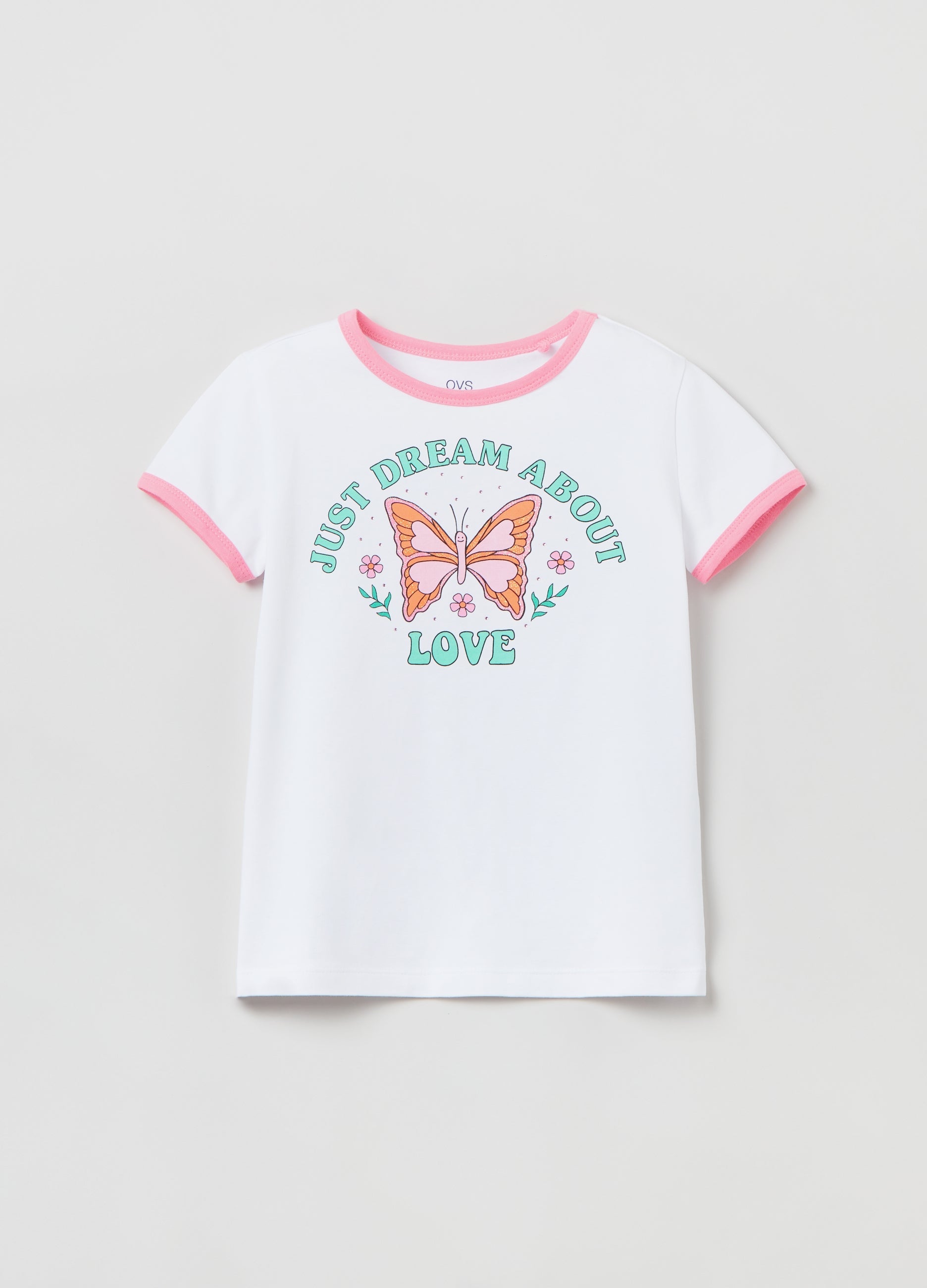 Stretch cotton T-shirt. Round neckline. Printed lettering print and butterfly with glitter lettering and diamanté appliqués.