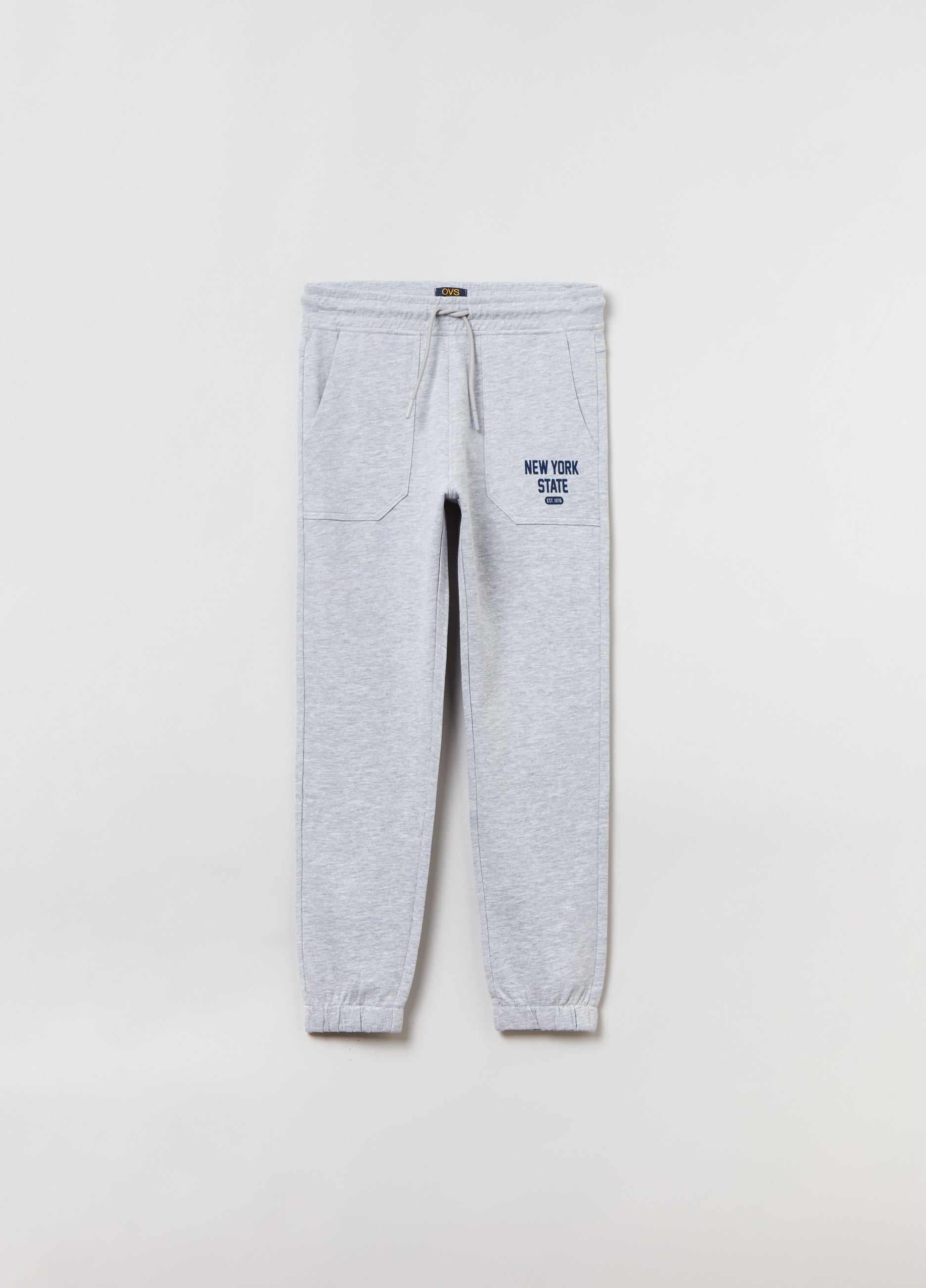 100% cotton plush joggers with drawstring. Elasticated waistband and ankles. Two front pockets and one patch pocket on the back. Printed lettering on the front.