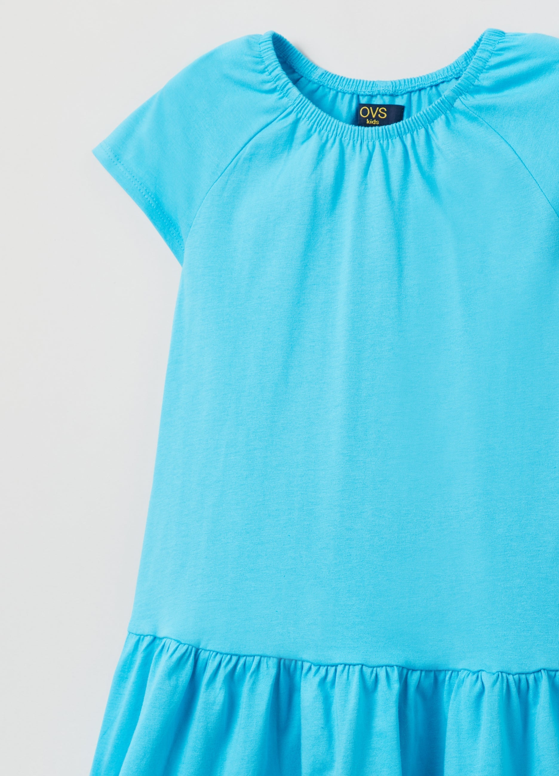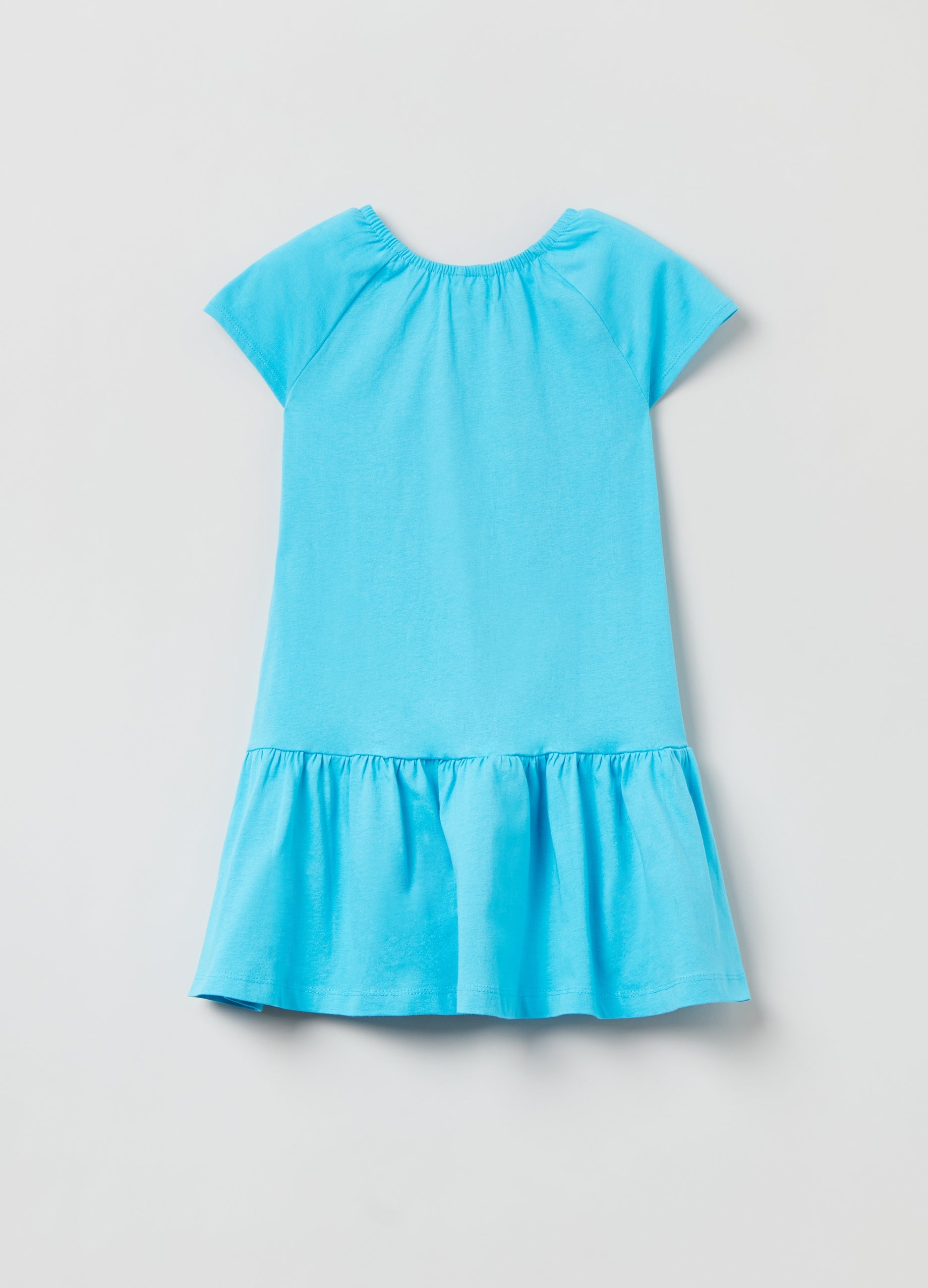 Dress in 100% cotton with flounced hem. Elasticated round neck. Raglan sleeves.