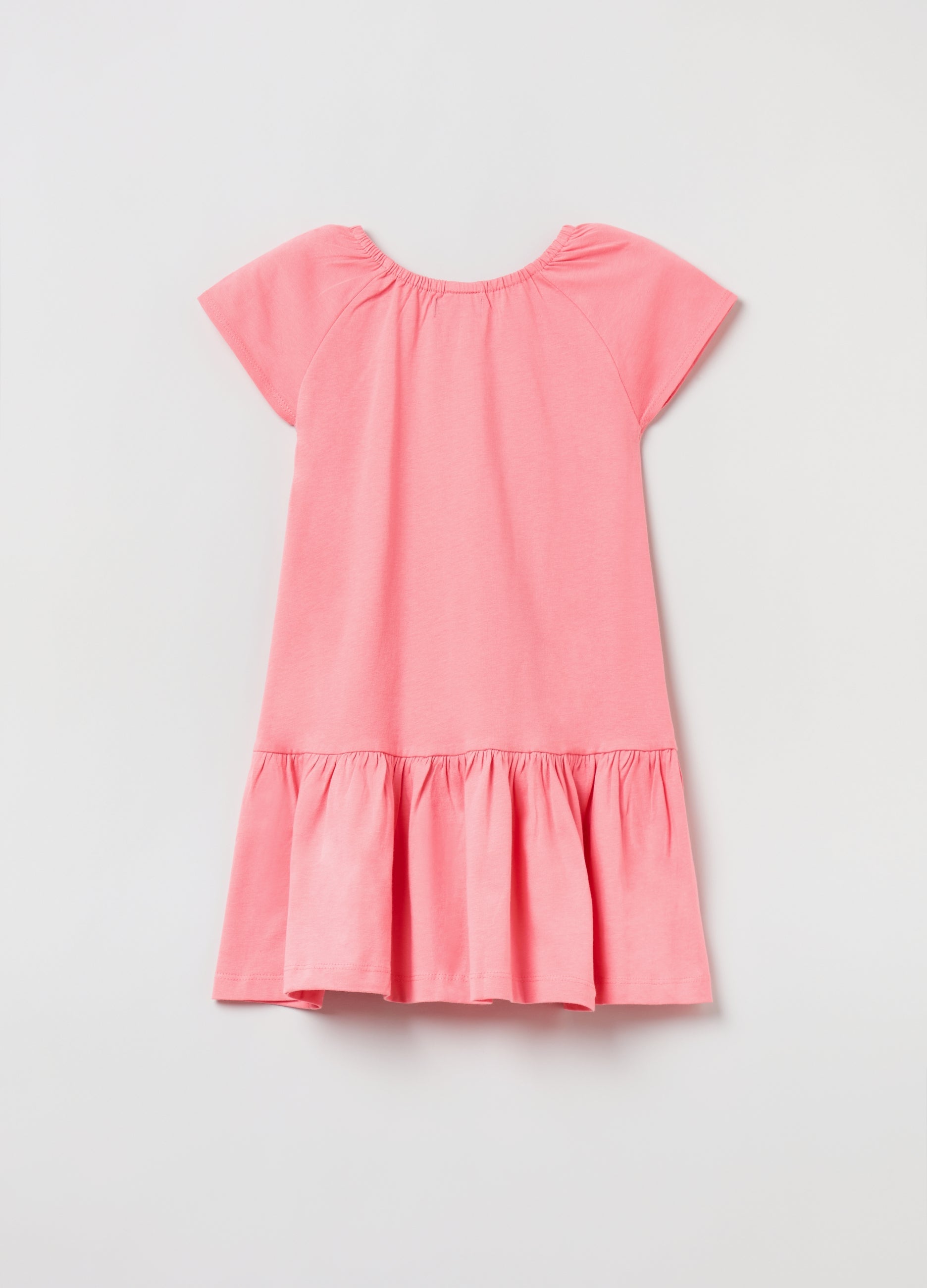 Dress in 100% cotton with flounced hem. Elasticated round neck. Raglan sleeves.