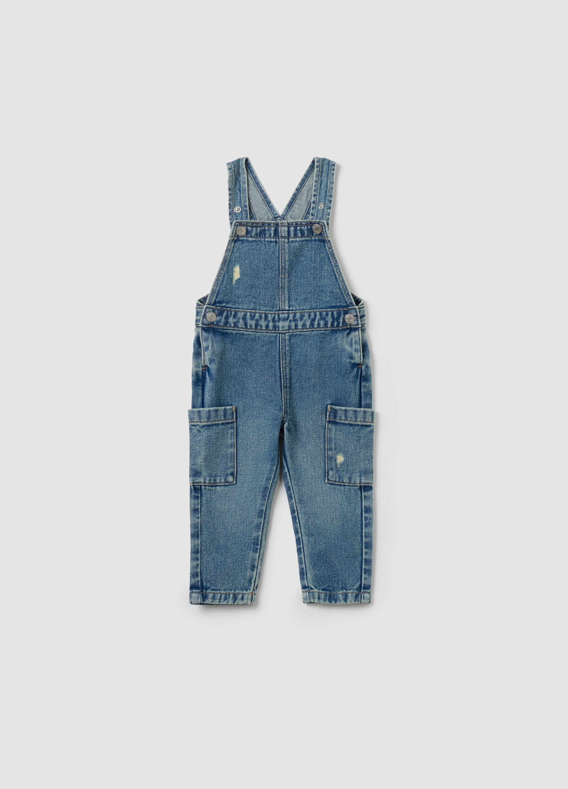 100% recycled cotton denim dungarees with abrasions. Adjustable spaghetti straps with snap buttons. Two patch side pockets. Fastening with buttons at the waist.