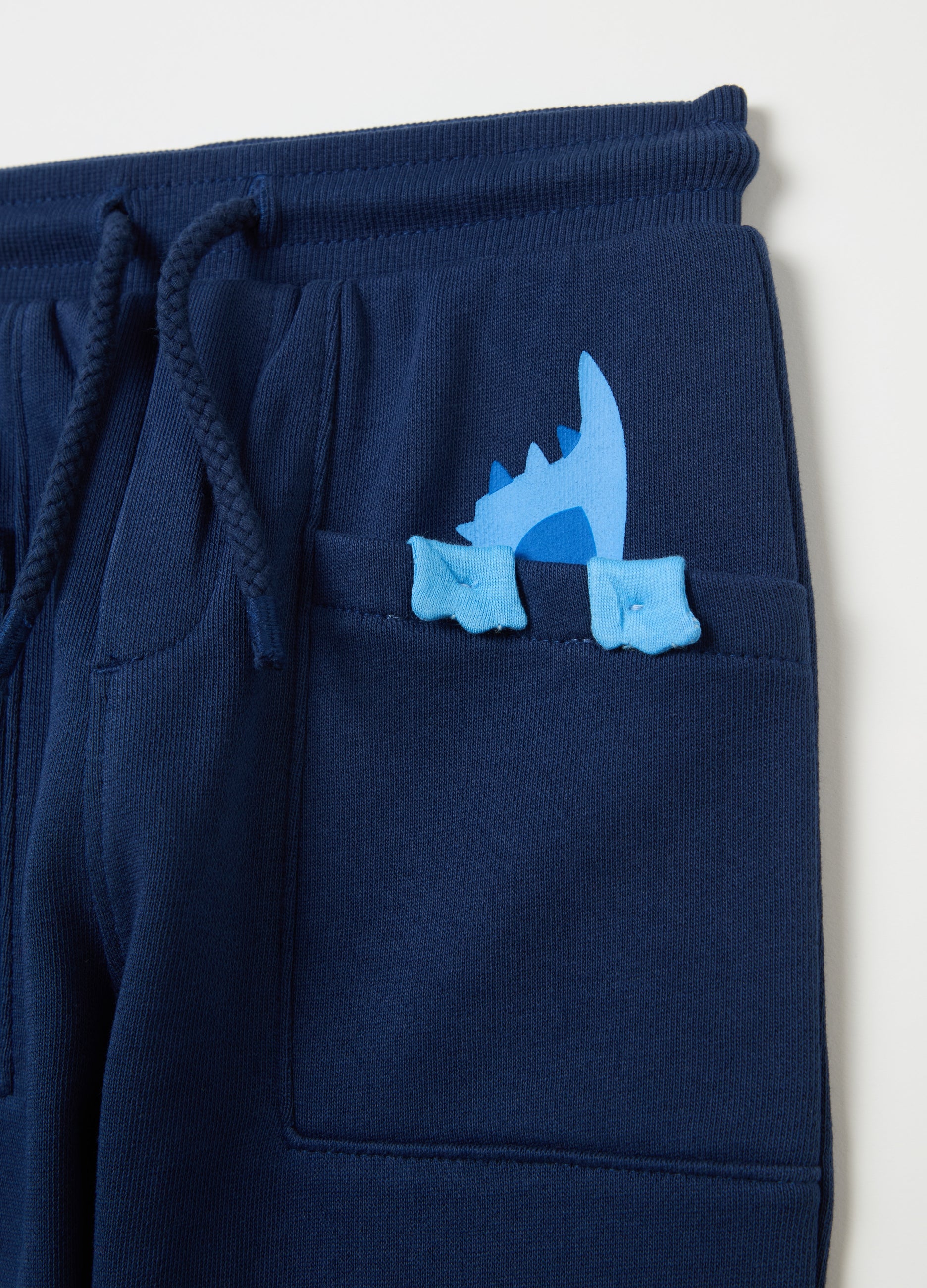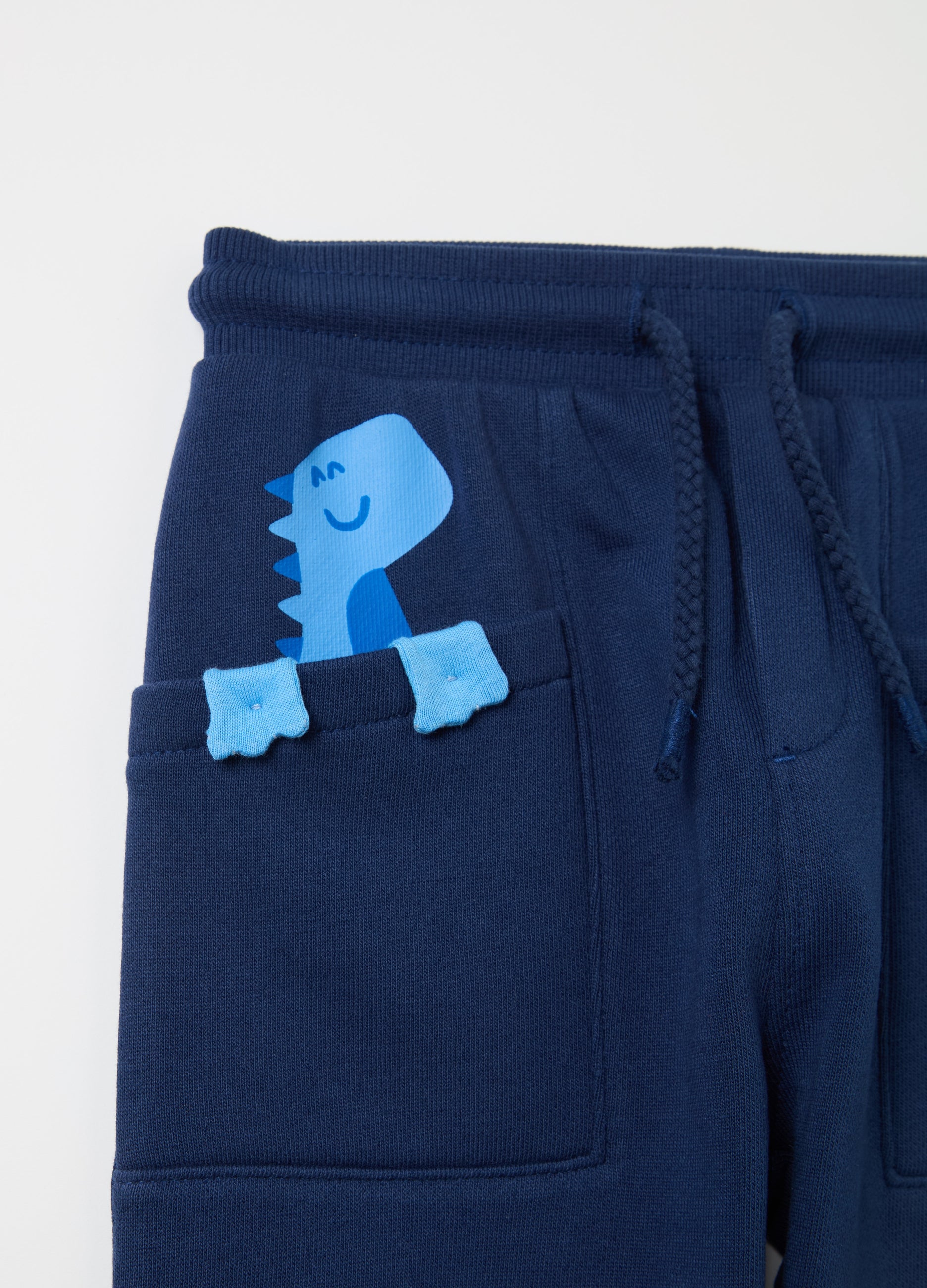 100% cotton French terry joggers (non-brushed fleece lining). Elasticated waist with cord drawstring. Two pockets with print and dinosaur application on the front. Turned up hem.