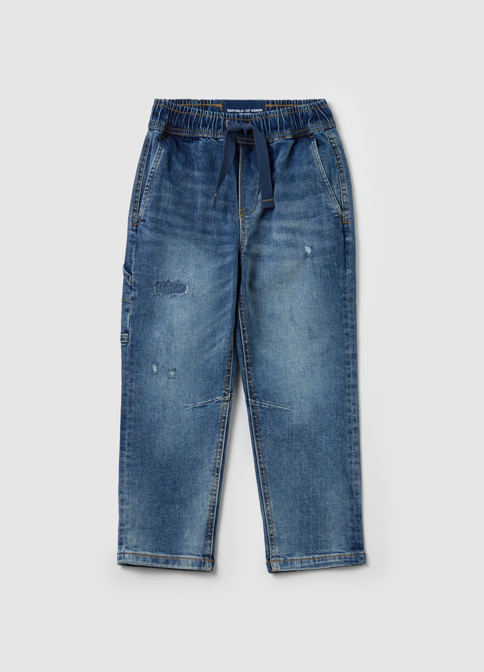 Carpenter joggers in stretch cotton denim with fading. Stretch waist with sash drawstring. Two vertical pockets, two patch pockets on the back and one patch pocket on the side.
