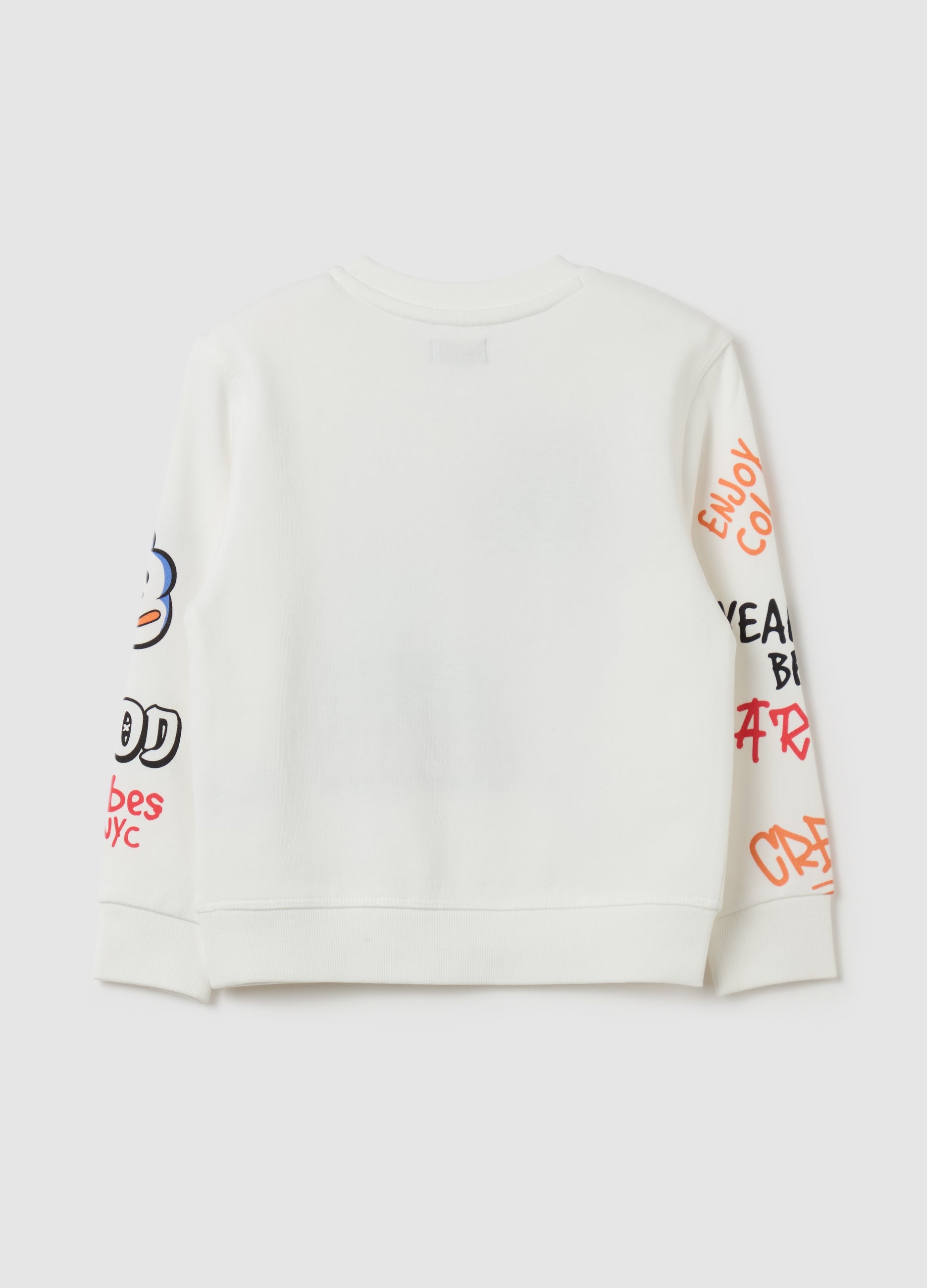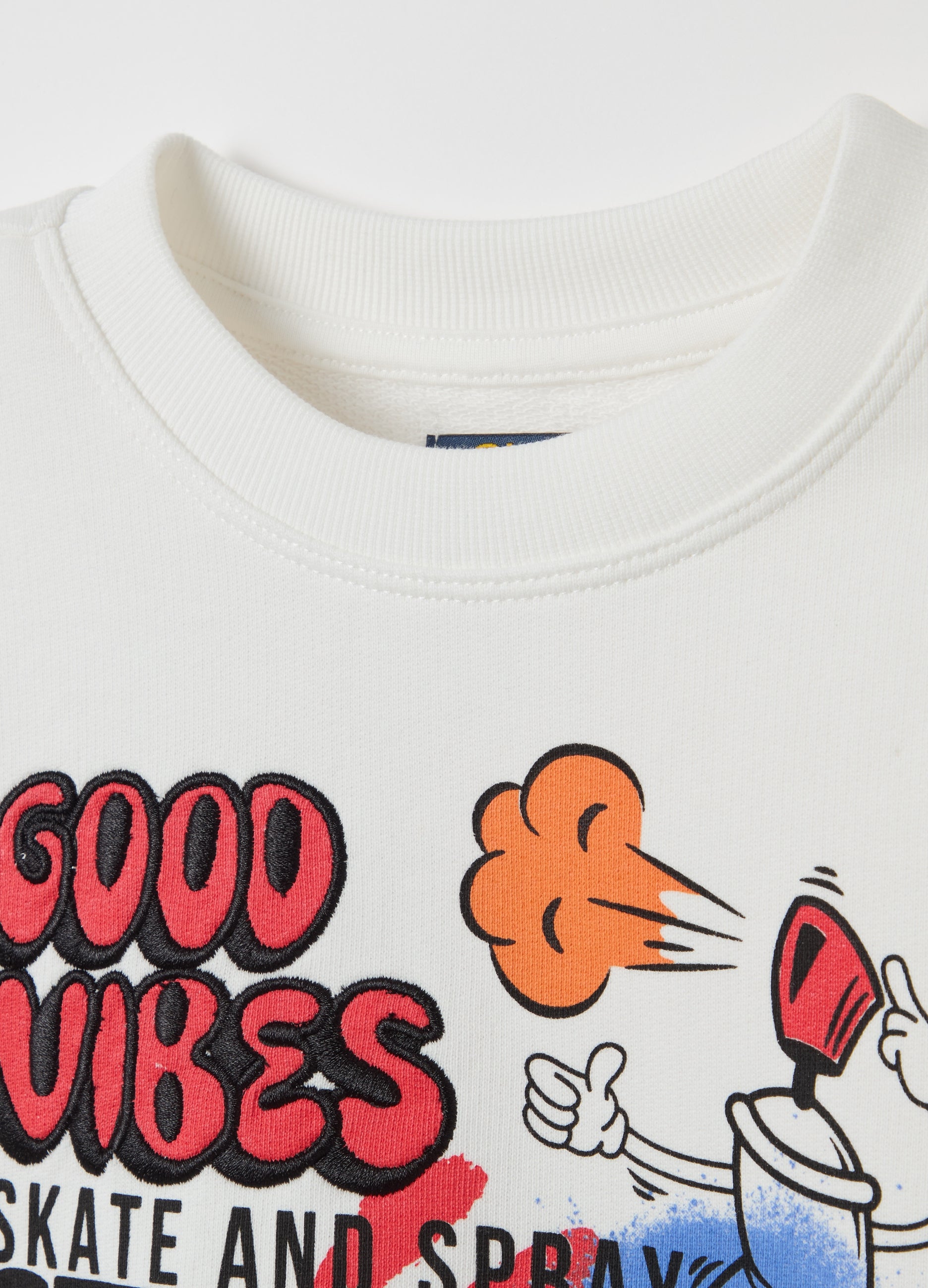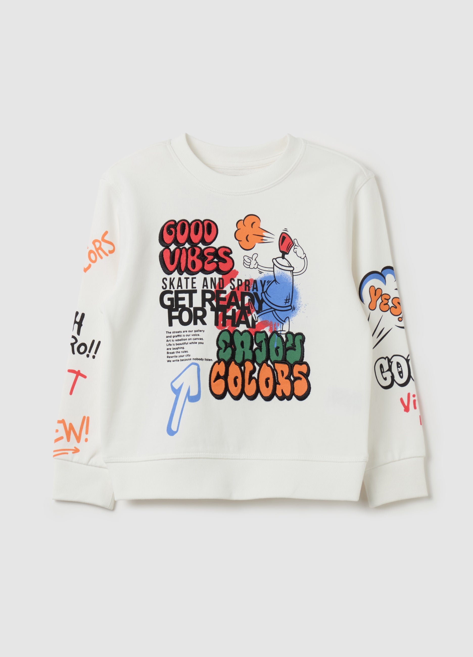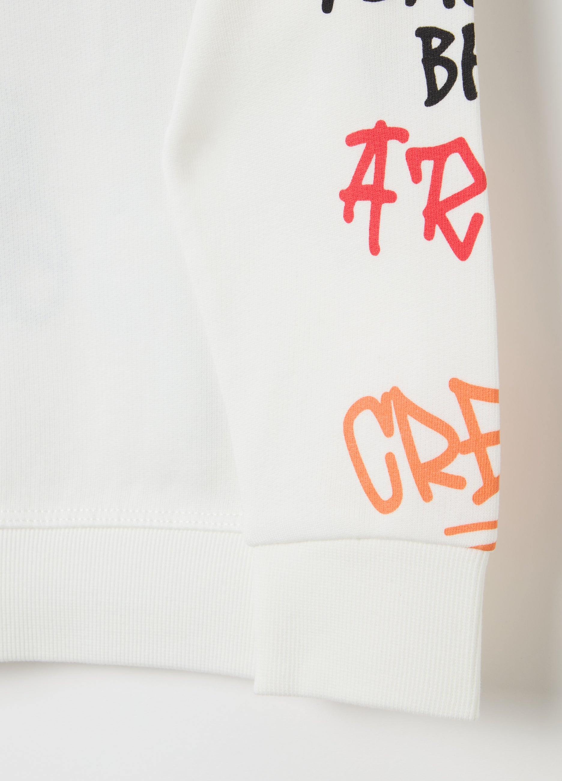 100% cotton French terry sweatshirt (non-brushed lining). Round neck. Graffiti-style lettering print with embroidered details on the sleeves and on the front. Ribbed trims.