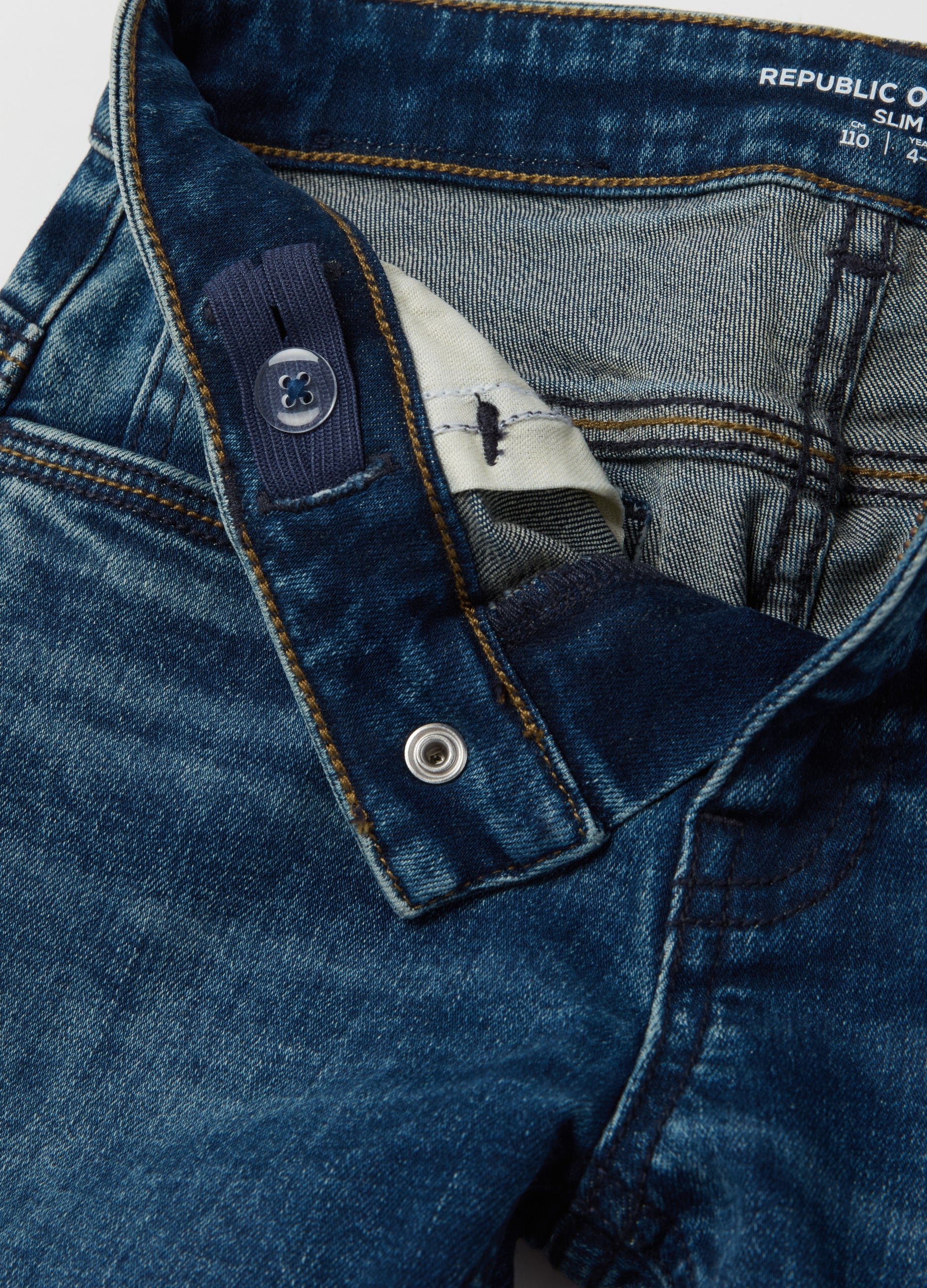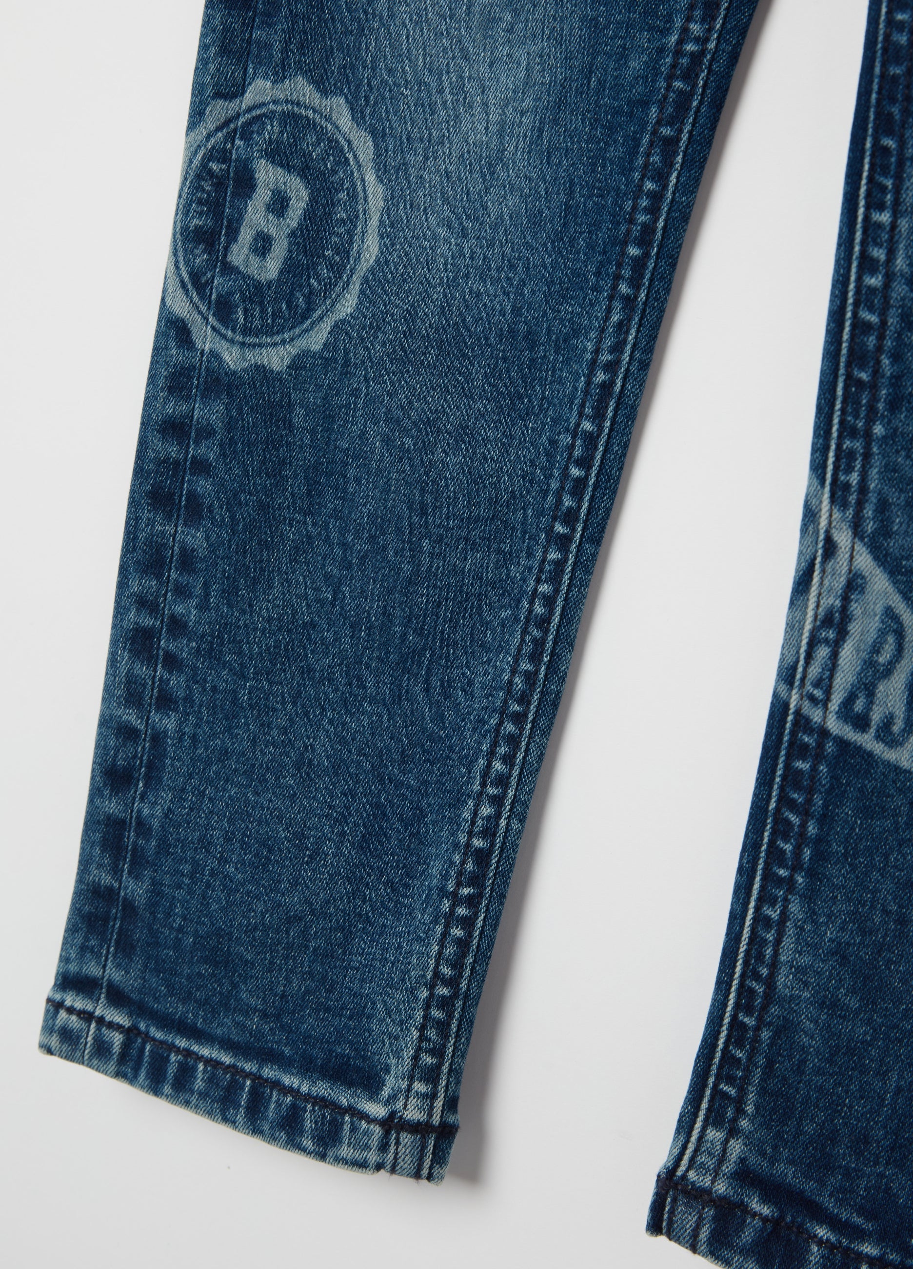 Slim-fit jeans in stretch recycled cotton. Internal waist adjustment. Five pockets. College-motif ''Varsity” lettering and crests print on the front. Zip and button fastening.