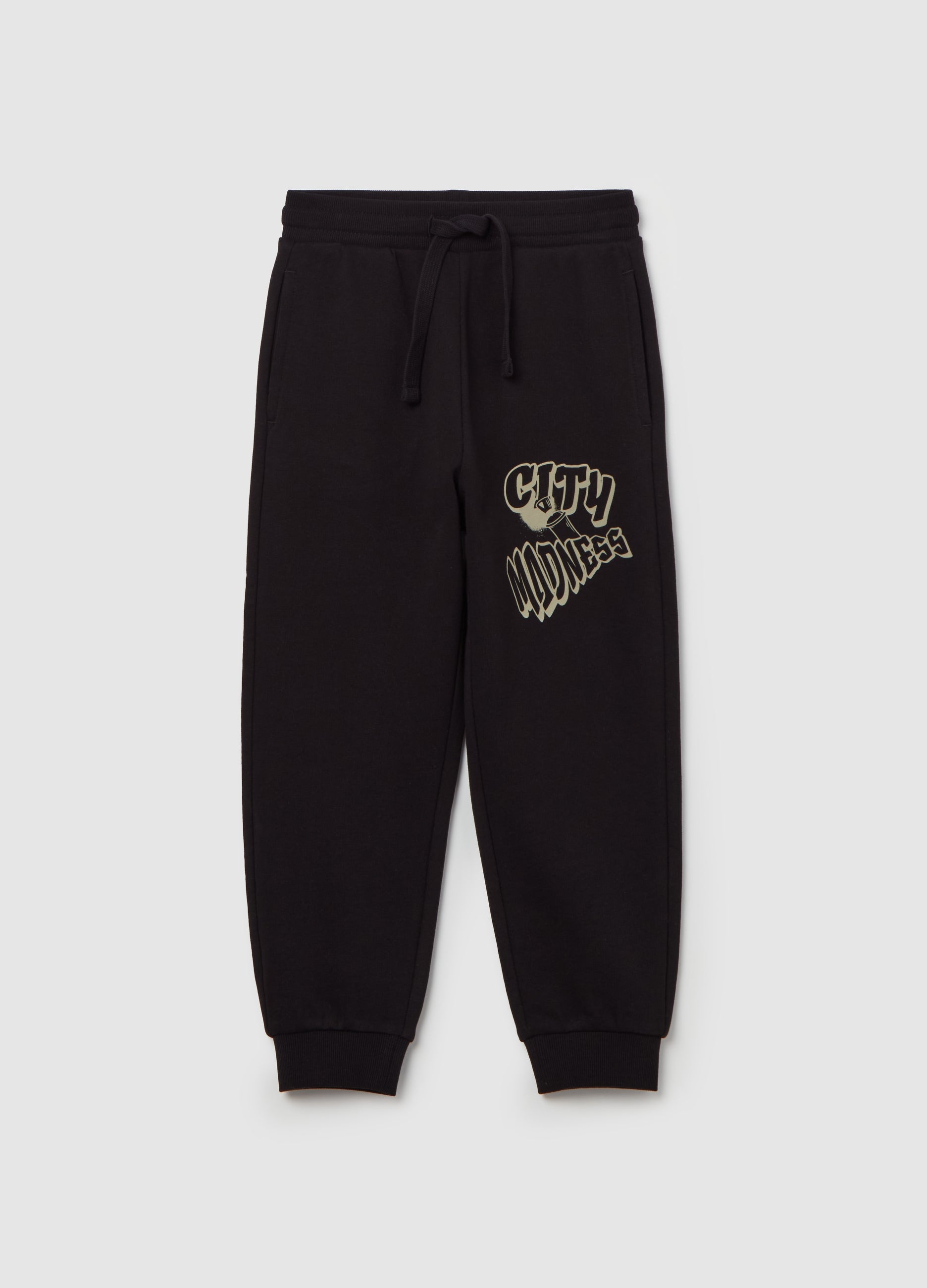 Joggers in 100% cotton plush with tape drawstring. Two vertical pockets and one patch pocket on the back. Lettering and off-road vehicles print on the side. Ribbed ankle cuffs.